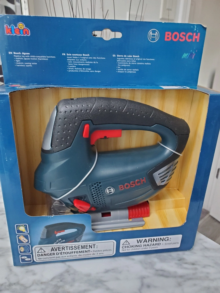 Selling a brand new Bosch Mini Jigsaw toy, still in its original box! This replica toy has child-compatible functions, including jigsaw motion and realistic sawing noise. It also has light and harmless sparks for added fun. Recommended for ages 3 and up, it's a great way to introduce kids to tools in a safe and engaging way