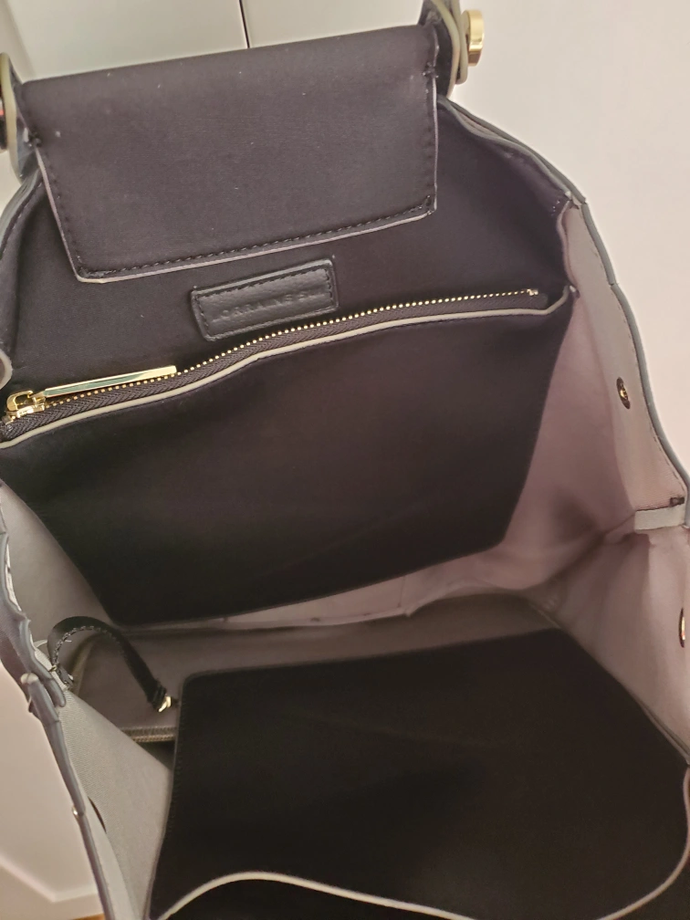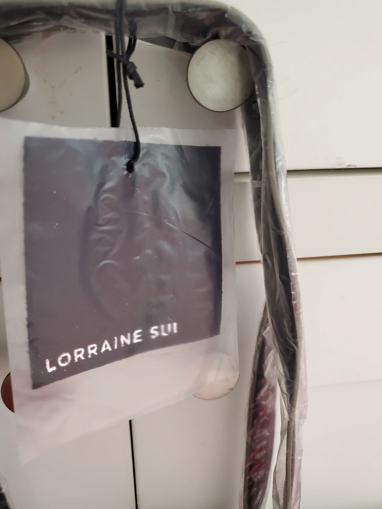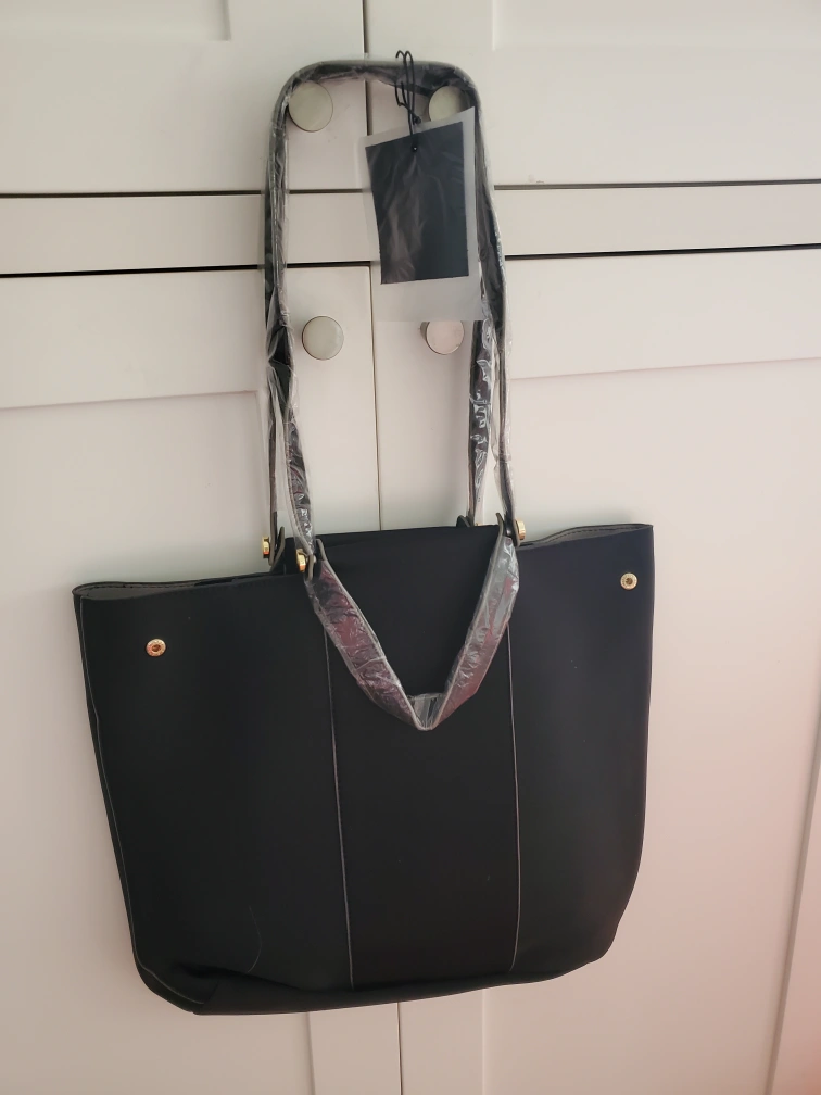 A stylish black tote bag from Lorraine Sui. This bag is perfect for carrying your essentials with its spacious interior. Neoprene material so it's great for the rain.