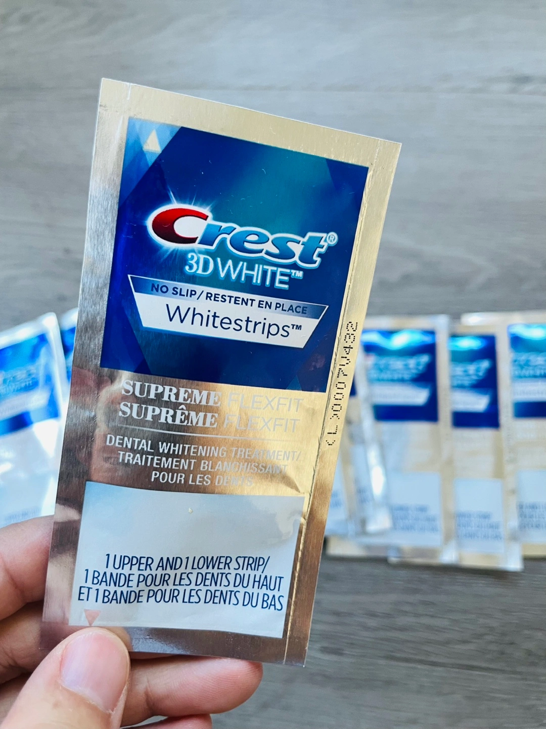 Selling individual Crest 3D White Whitestrips in the Supreme Flexfit style! They offer a dental whitening treatment that's easy to use. Each strip is designed for both upper and lower teeth. Freshen up your smile!