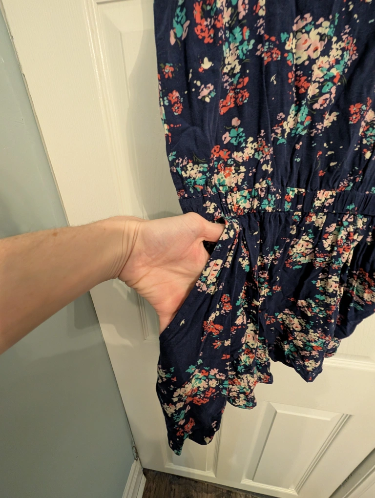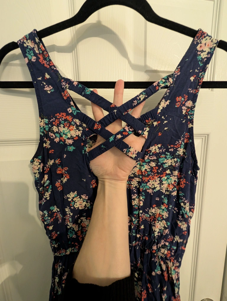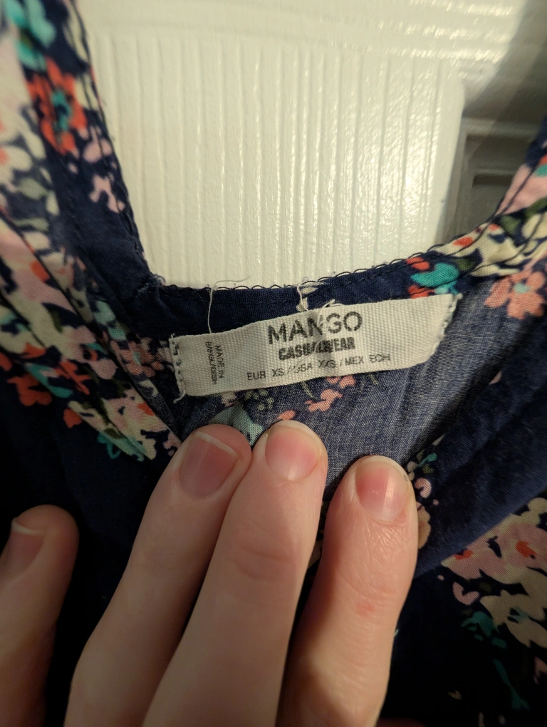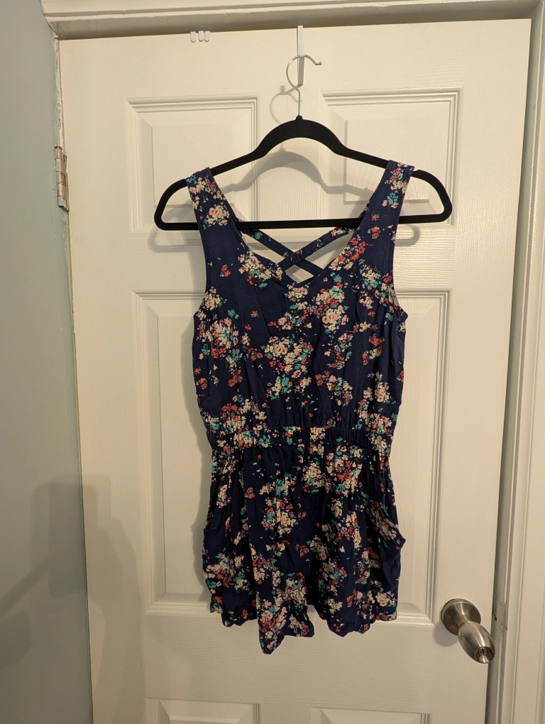 Cute romper from Mango with a floral pattern. It's a size XS and has a criss-cross back design. Perfect for casual wear, and it even has pockets! I adore this piece but it has become too tight on me. Still has so much wear and life left to it! Take her home and love her because I can't!