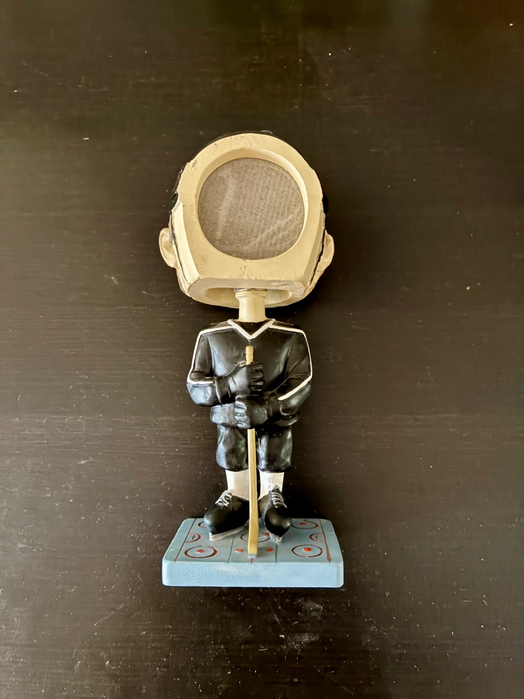 Customizable six-inch hockey bobblehead figurine. It features a hockey player in a black-and-white uniform and you insert the head shot of your choice. Great for kids.