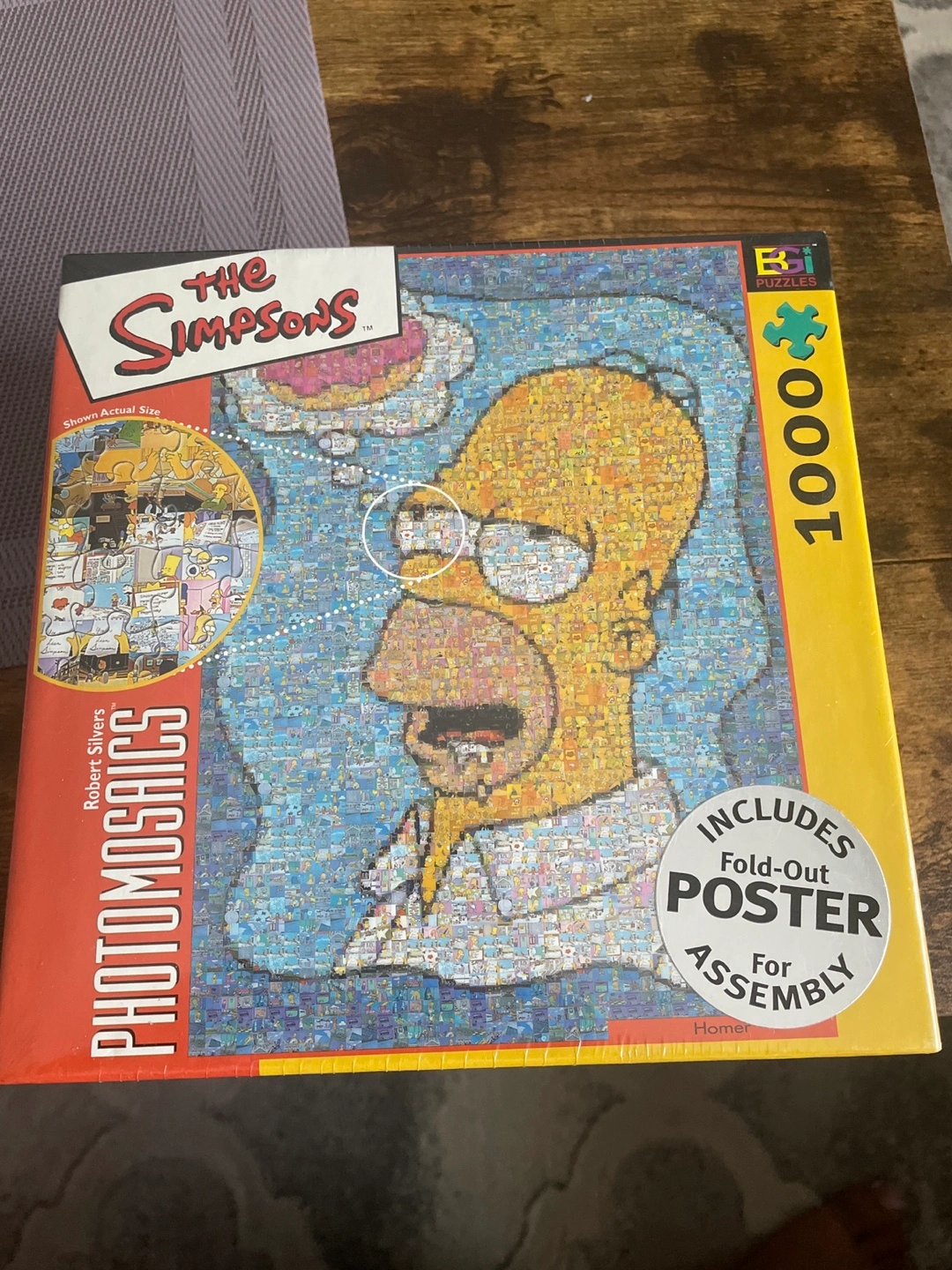 Selling a 1000-piece "The Simpsons" Photomosaics puzzle by BGI Puzzles! It features a cool design by Robert Silvers. The box says it includes a fold-out poster for assembly, which is super handy