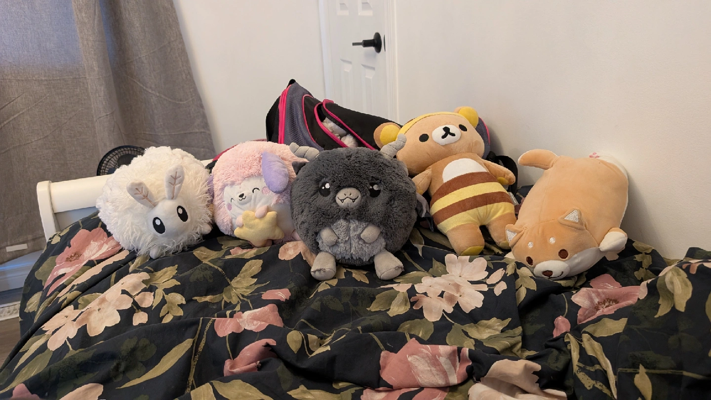 A collection of cute and cuddly plush toys looking for a new home! There's a variety of characters, including a fluffy white bunny, a pink hedgehog, a grey monster, a Rilakkuma bear, and a Shiba Inu dog. They're all in great condition and ready to be loved 5$ each