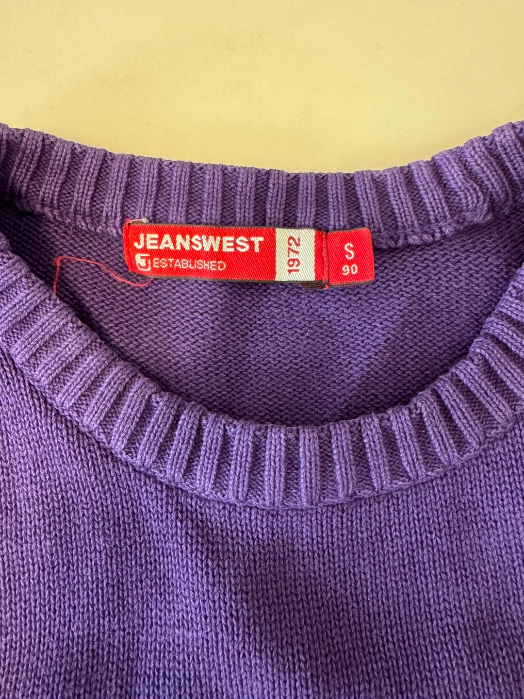 Cozy Jeanswest sweater in a lovely shade of purple! It's made from 100% cotton and is a size small. There are some small spots on the front, as pictured.
