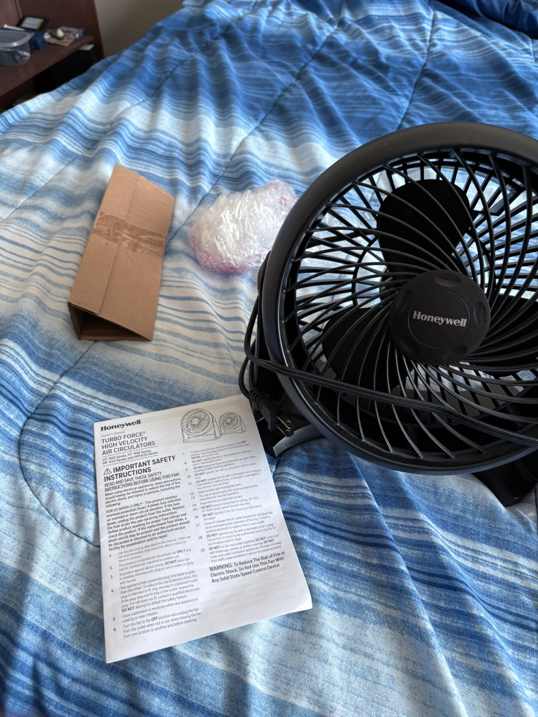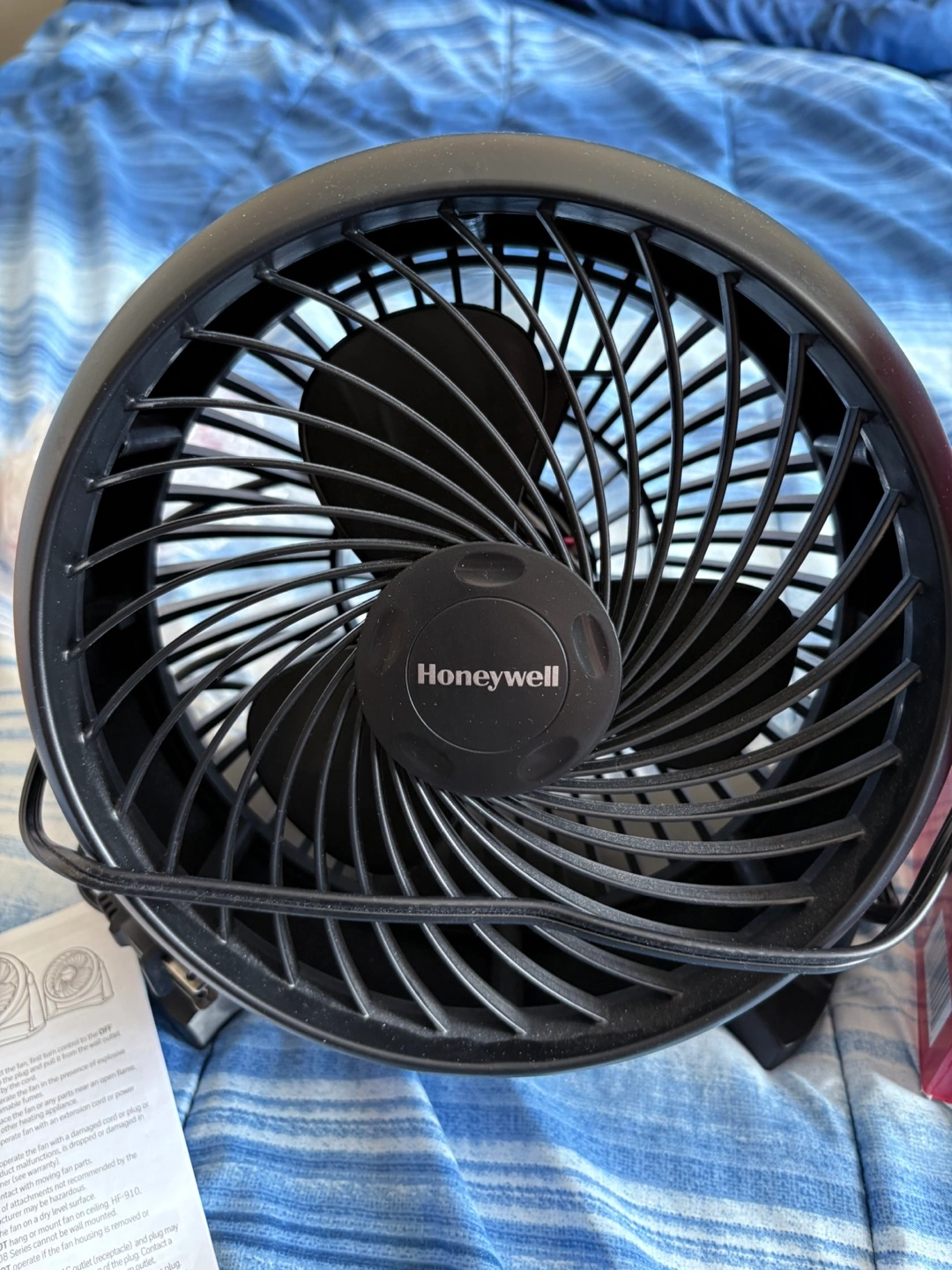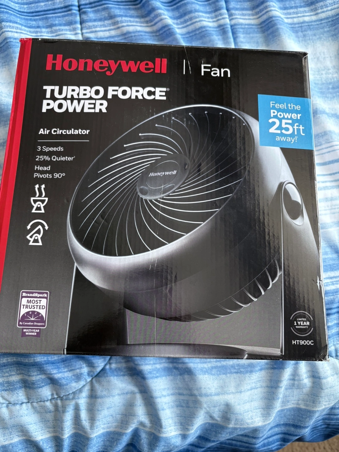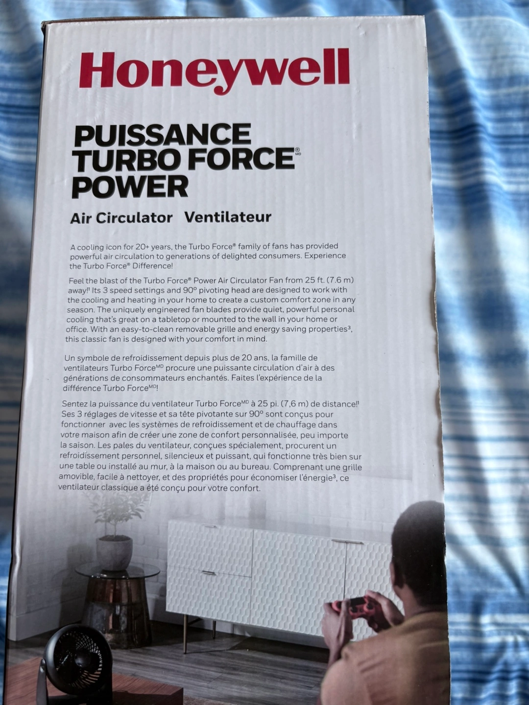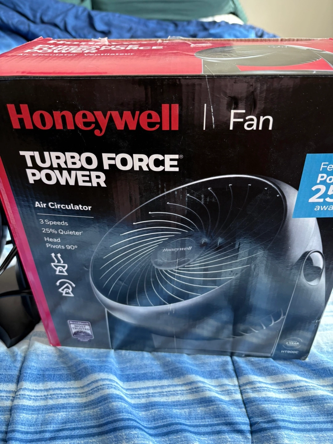 Selling a Honeywell Turbo Force Power fan in excellent condition! It's an air circulator with 3 speeds and a head that pivots 90 degrees. The box is included, along with the instructions