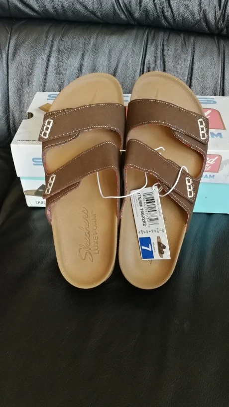 Brand new pair of Skechers Relaxed Fit Two Strap sandals with Luxe Foam and arch support in women's size 7 Chocolate colour, come in the original box. serious inquiries please pick up in downtown close to St Patrick station, Dundas-University area