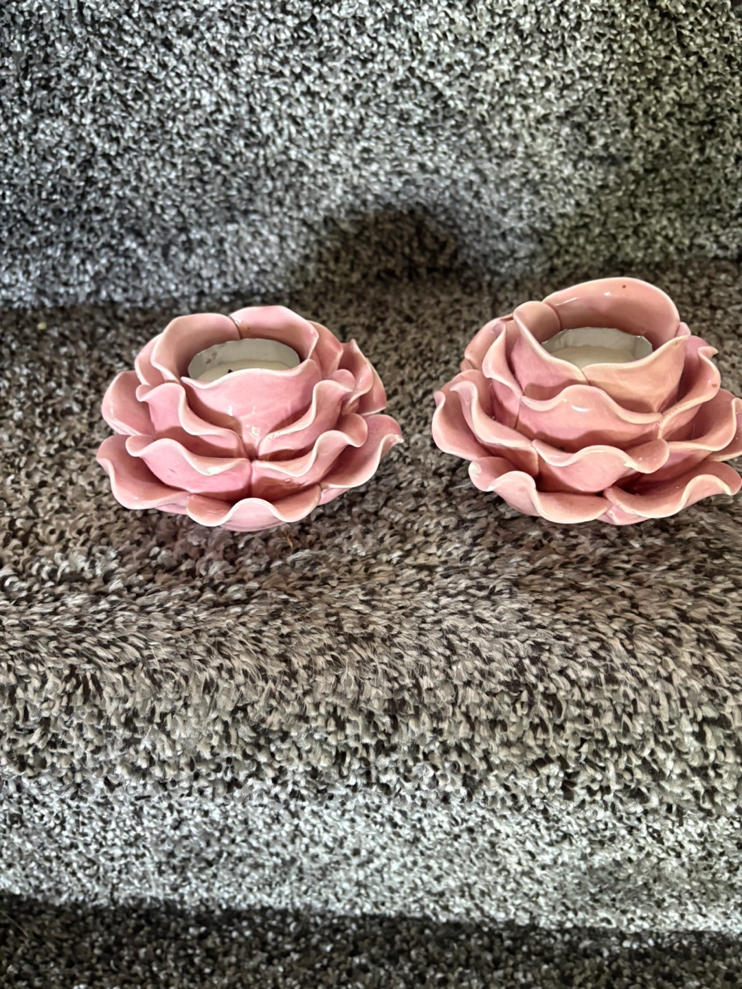 These are a pair of lovely pink ceramic candle holders shaped like roses. They'd be perfect for adding a touch of charm to any room! They are in excellent condition and ready to brighten up your space
