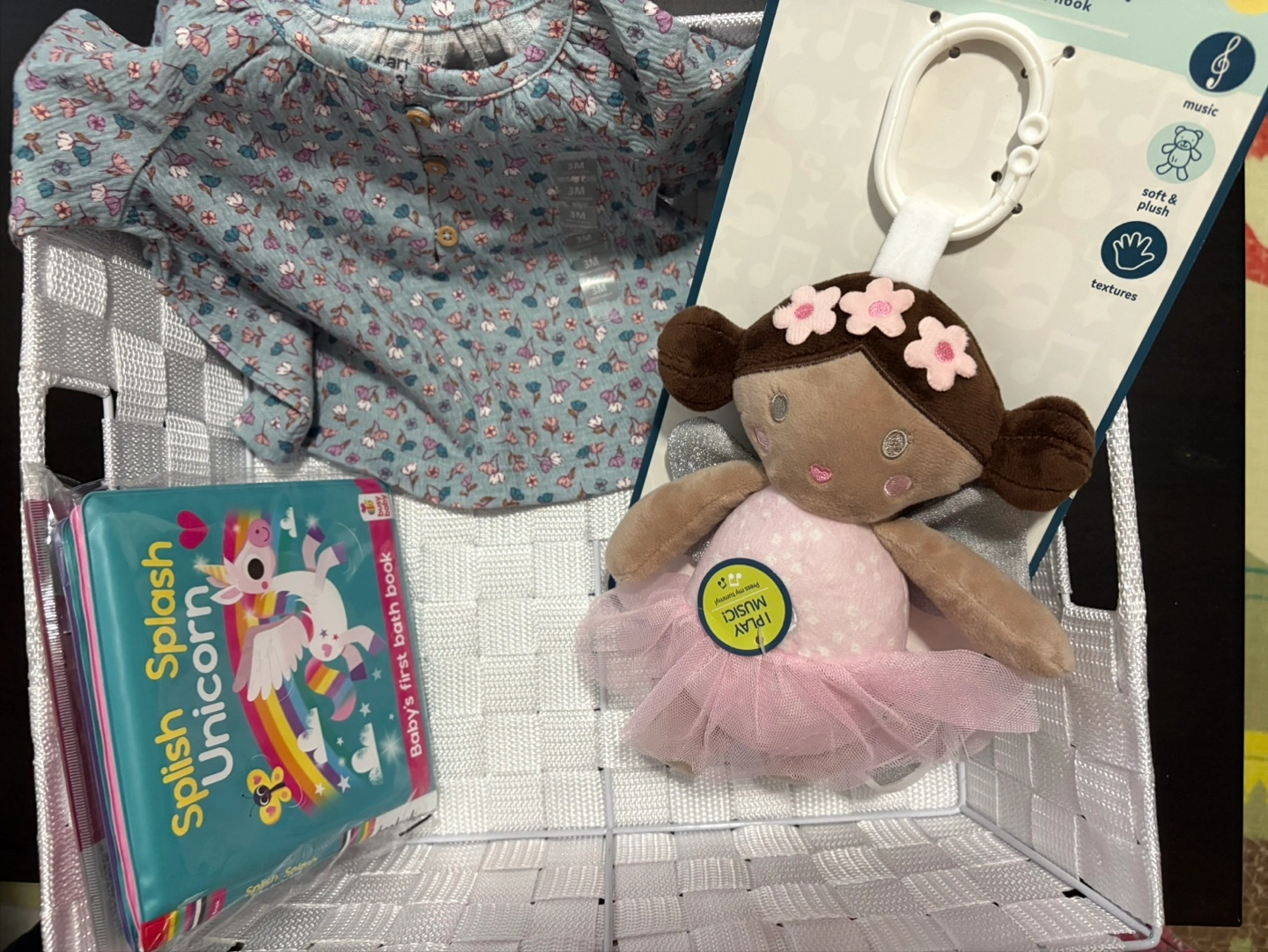Selling a cute baby bundle! It includes a 'Splish Splash Unicorn' bath book, a floral baby shirt (size 3M), and a musical plush toy. All items are in great condition and ready for a new home
