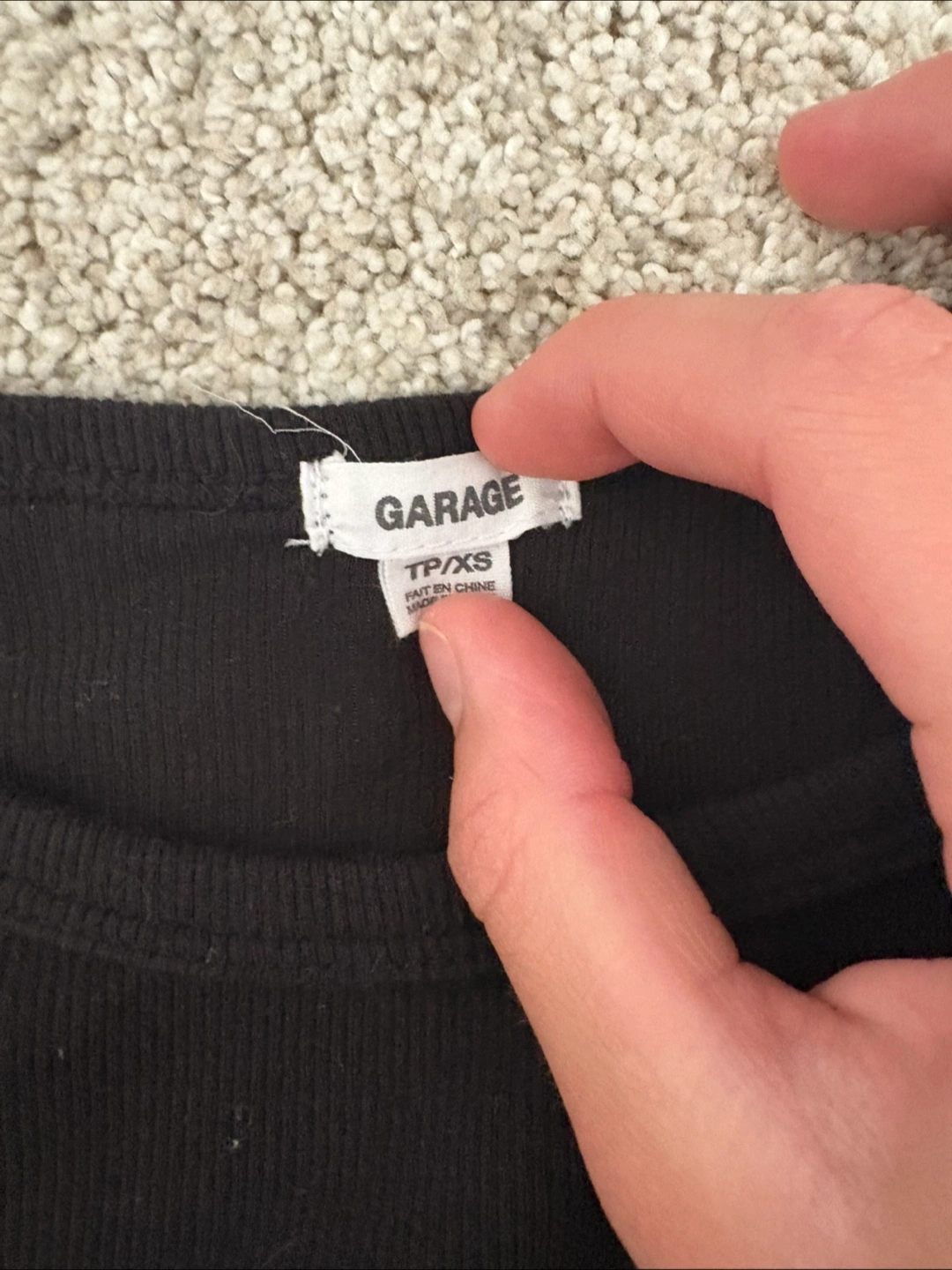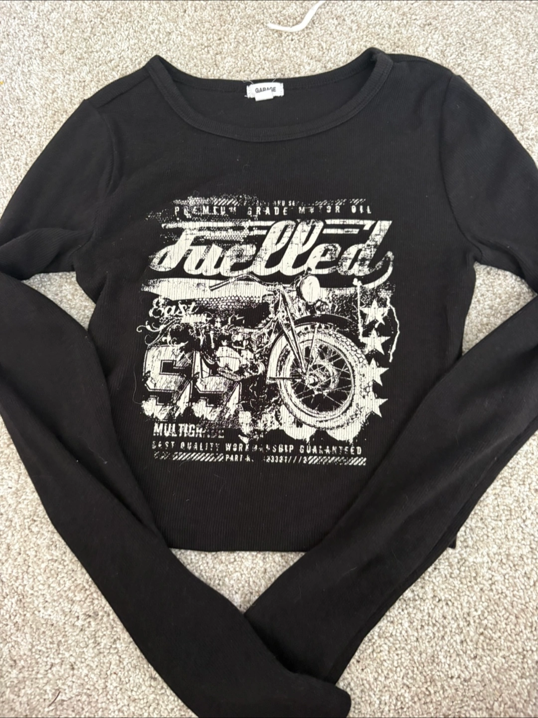 I'm selling a cute black long-sleeve top from Garage. It's a size XS and features a motorcycle graphic on the front. Perfect for adding a bit of edge to your outfit!