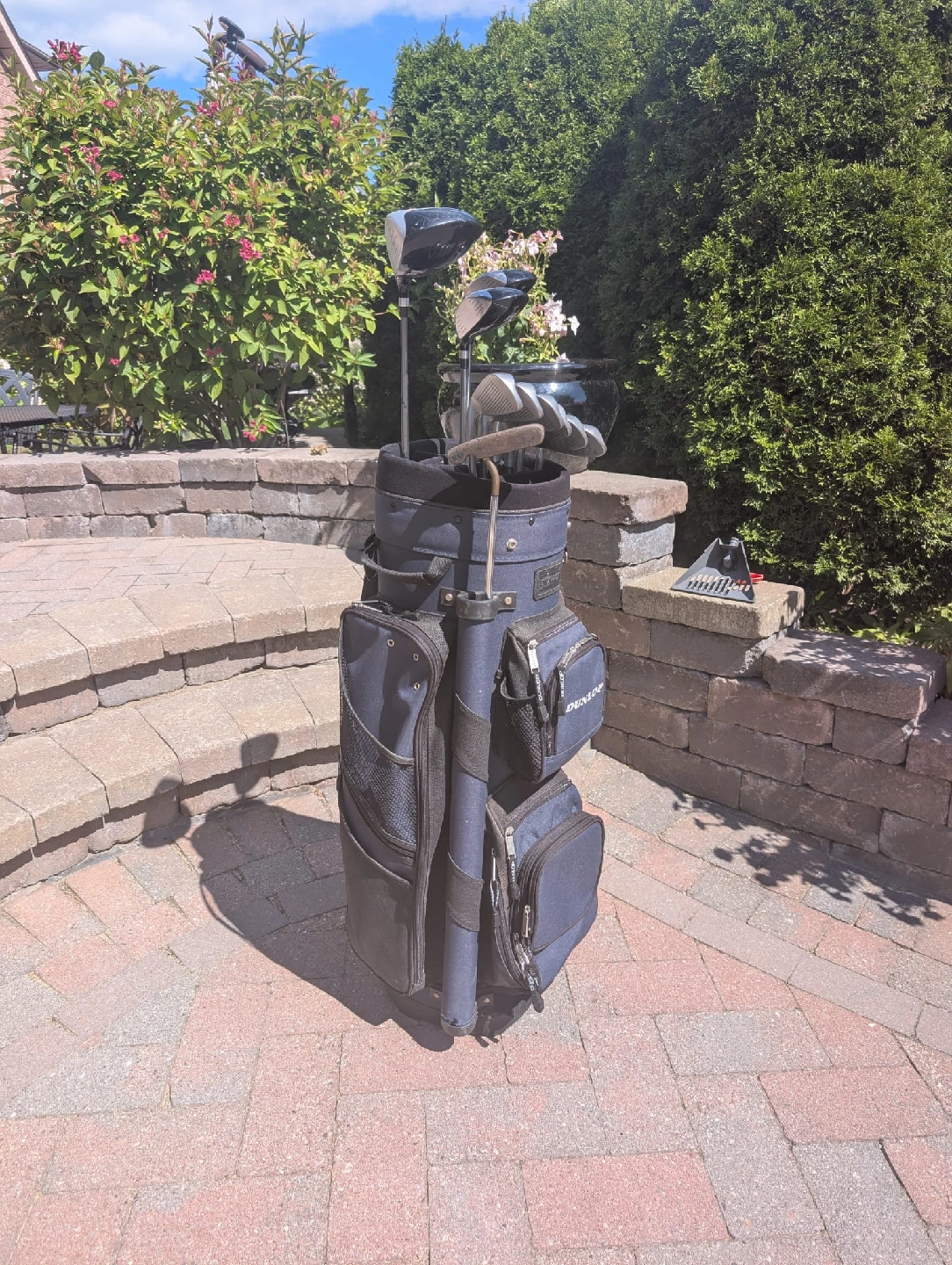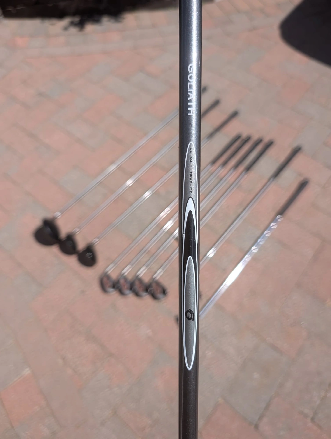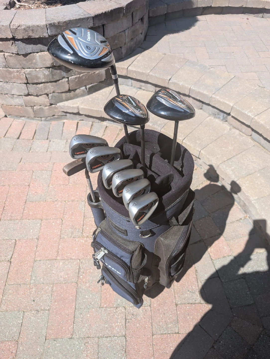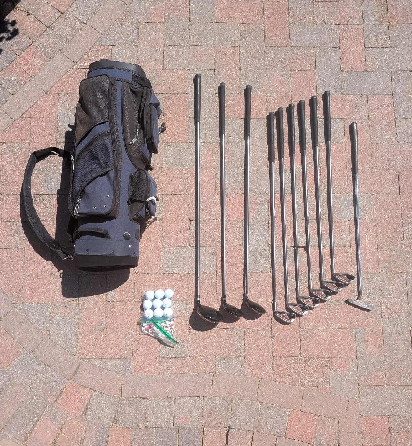 Right handed golf clubs with golf bag Goliath Capture2 Ultralite graphite shafts Driver 1,3,5 Irons 5,6,7,8,9,P Dunlop putter Blue and black Dunlop golf bag with carry strap Golf balls and Tees included