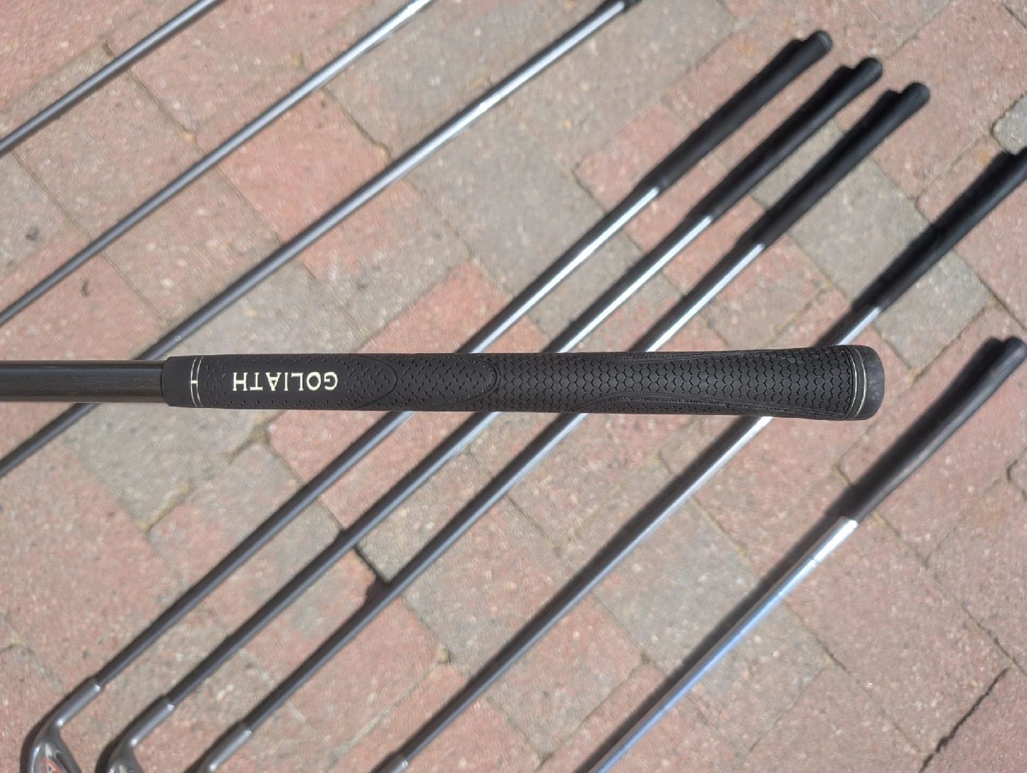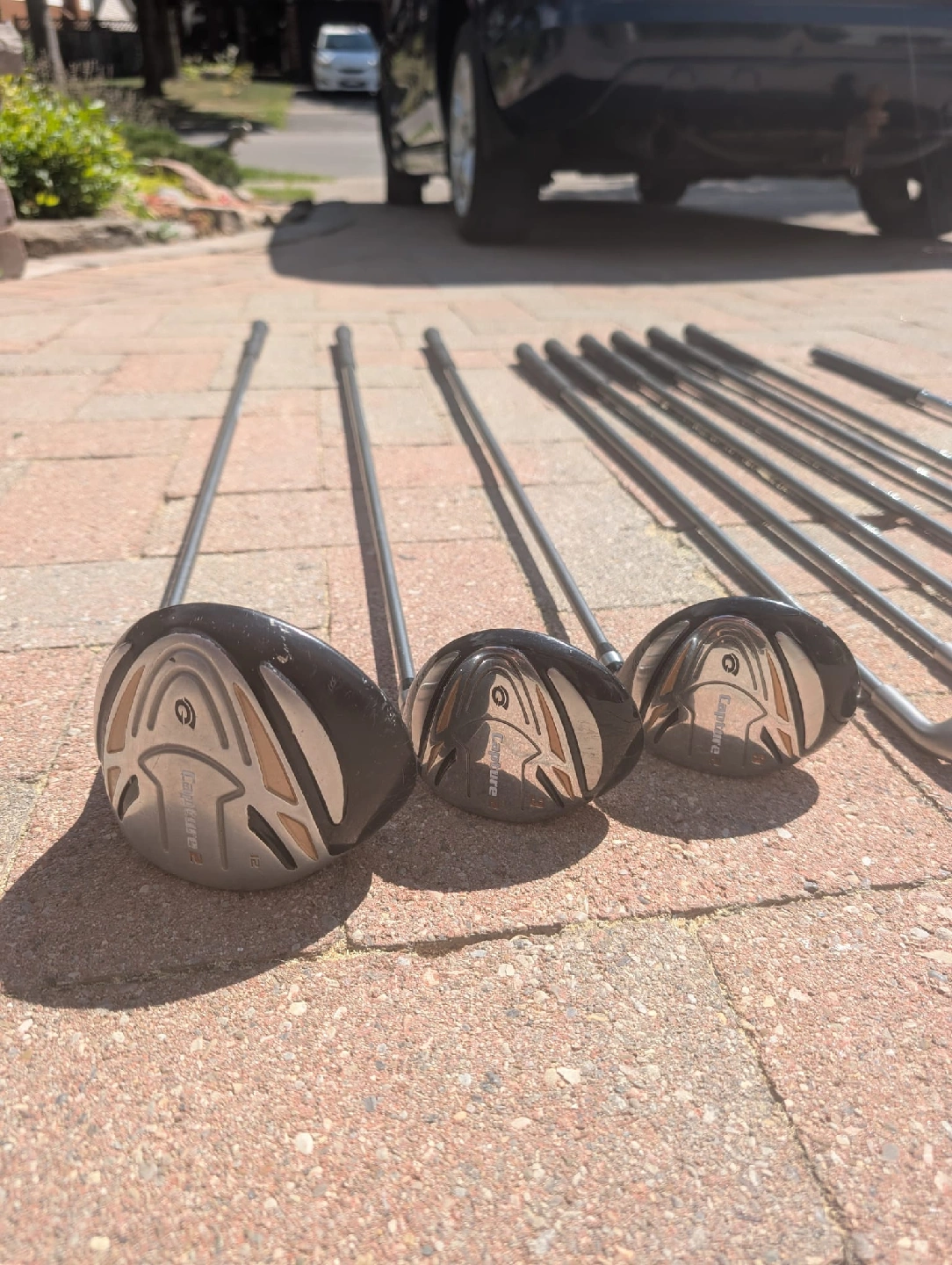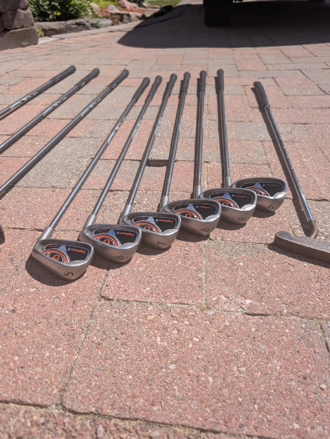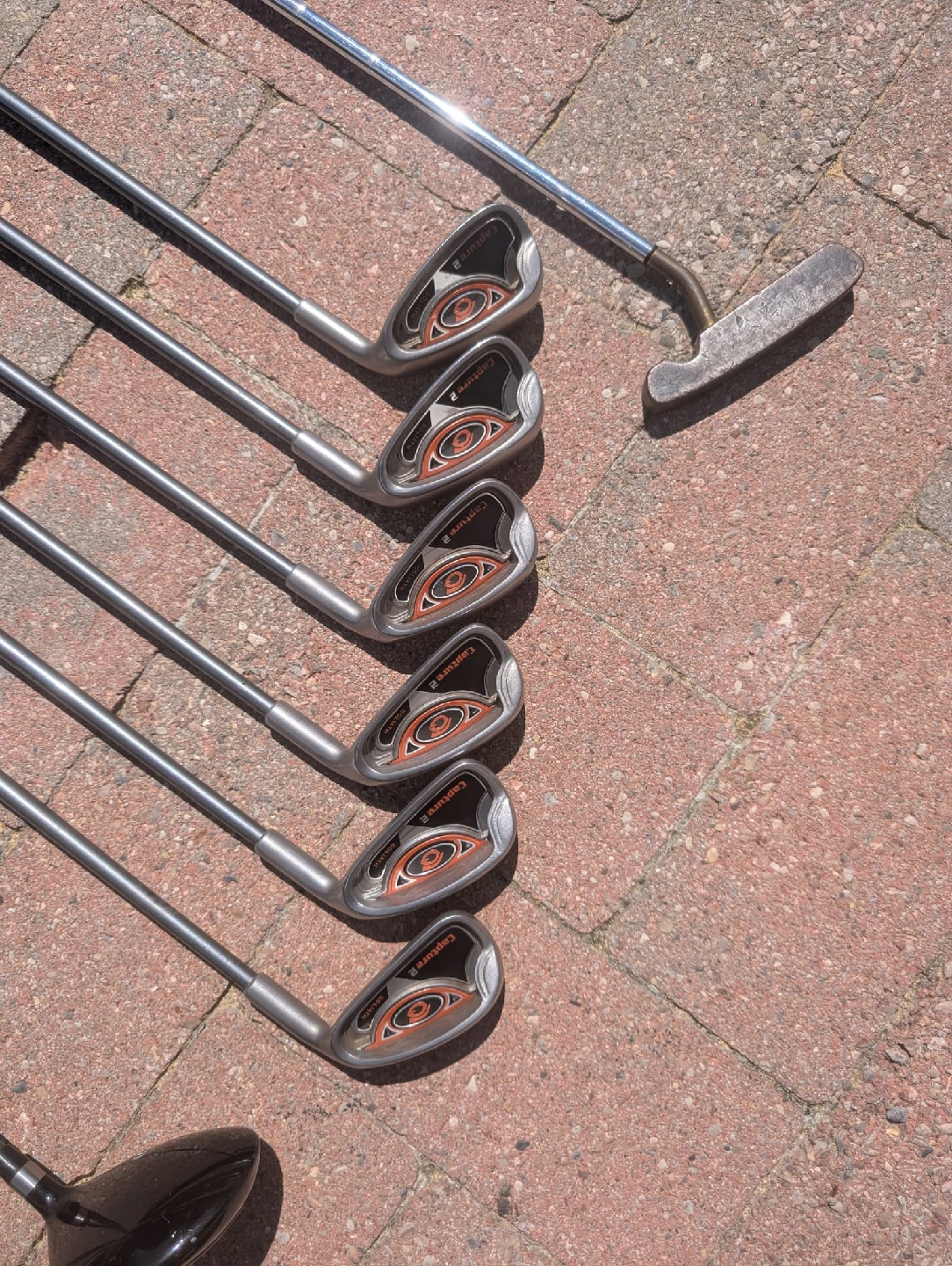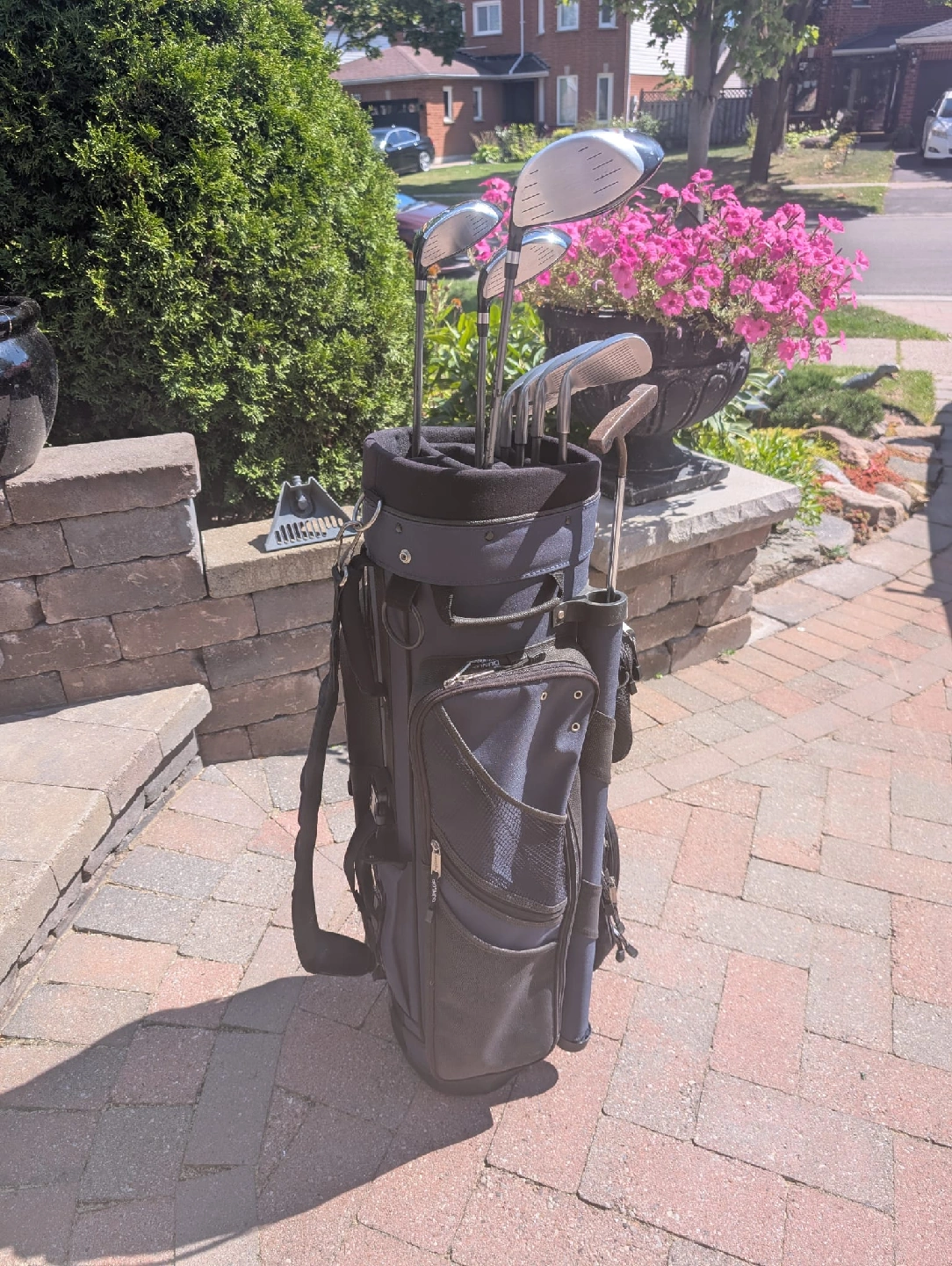Right handed golf clubs with golf bag Goliath Capture2 Ultralite graphite shafts Driver 1,3,5 Irons 5,6,7,8,9,P Dunlop putter Blue and black Dunlop golf bag with carry strap Golf balls and Tees included