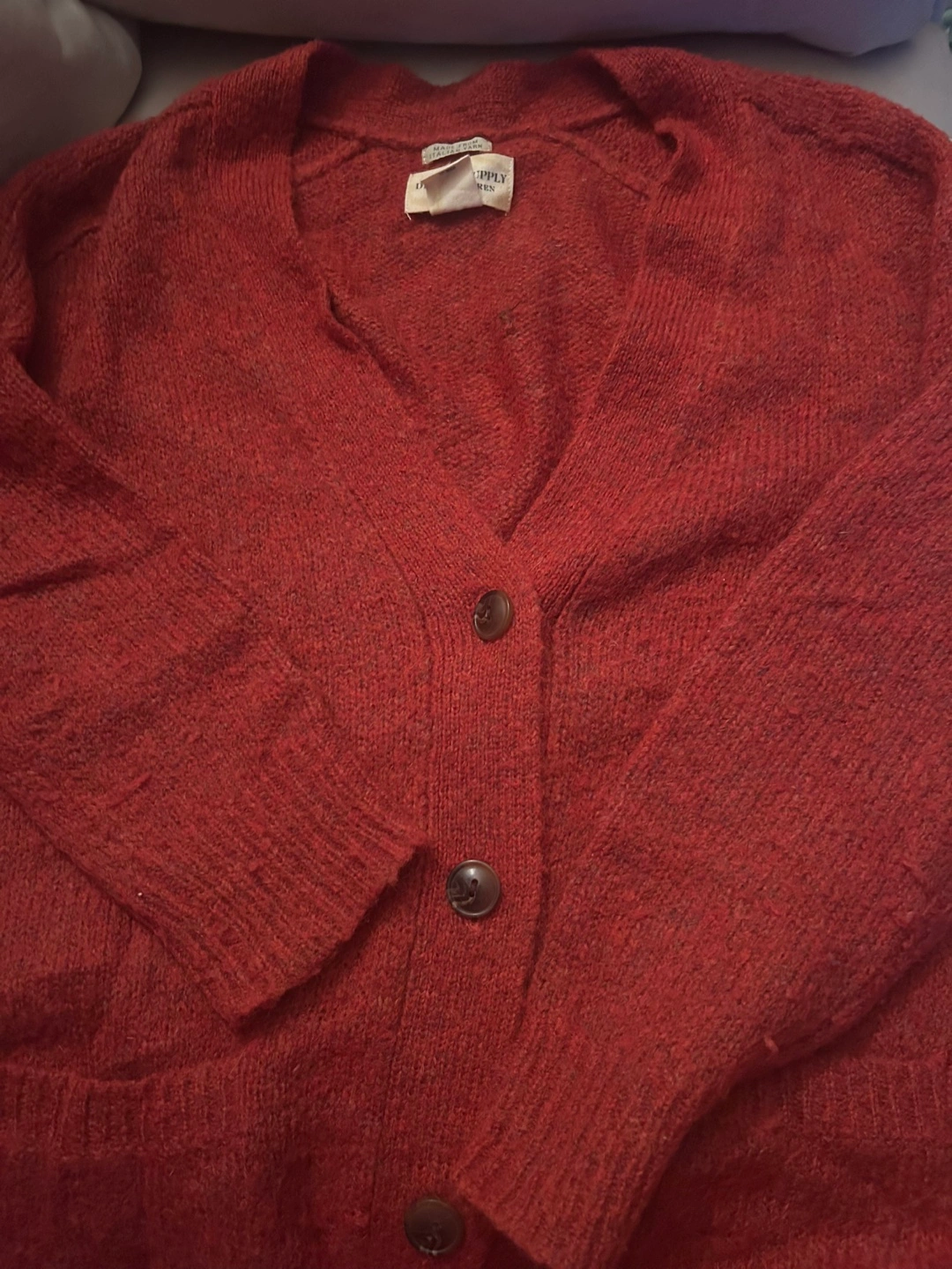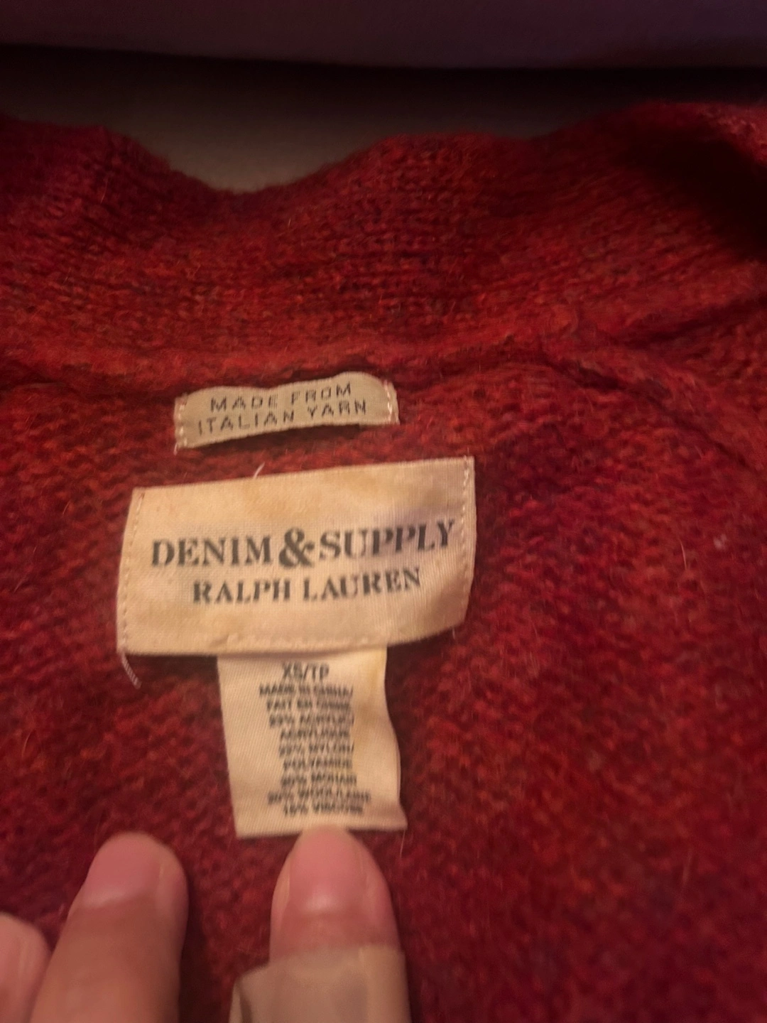 Cozy Denim & Supply Ralph Lauren cardigan made from Italian yarn! It's a size XS and features a classic button-down design. The material is a blend of 55% nylon, 20% wool, 15% acrylic, and 10% viscose