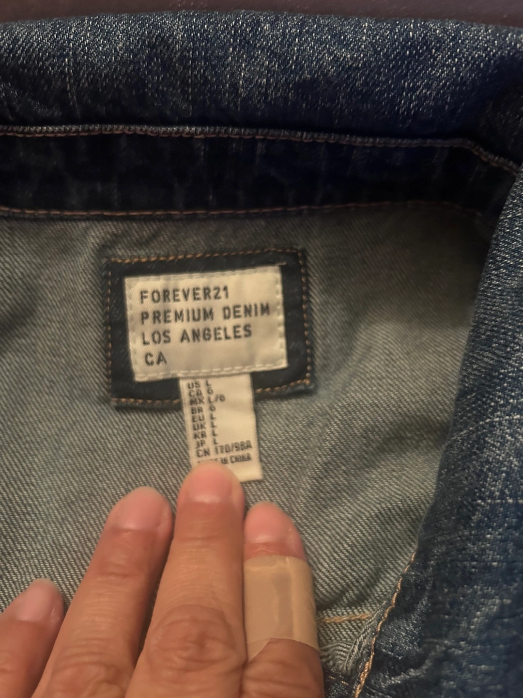 Selling a Forever 21 denim jacket in size L. As with all forever 21 this jacket fits small. It's a premium denim jacket from Los Angeles, CA. Perfect for adding a stylish touch to your outfit!