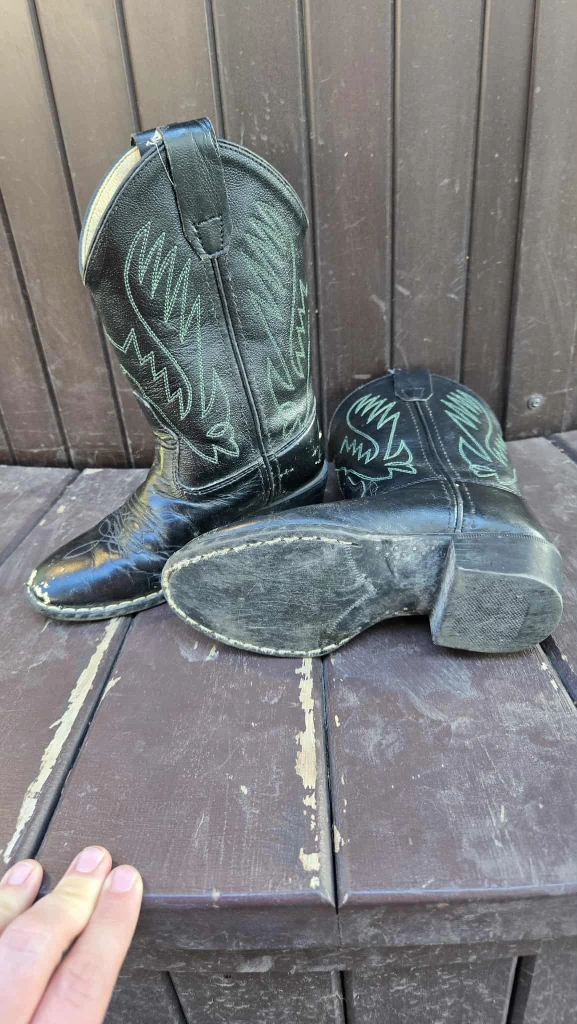 No longer fits, but was worn quite a bit. He was 5 through 6 when he was able to wear them. Have scuffs on toes but shoe polish will clean that up nicely. Located in Acadia Cross posted