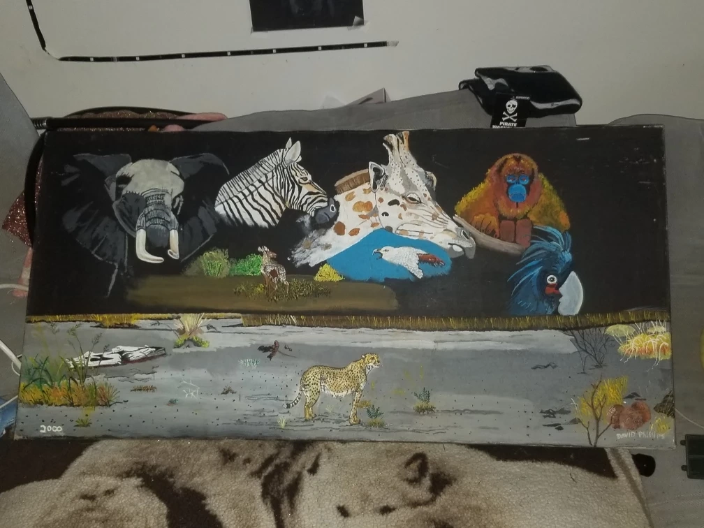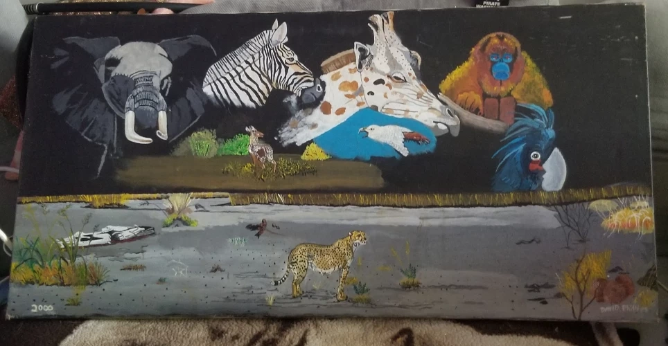 This is a painting of various animals including an elephant, zebra, giraffe, cheetah, and more