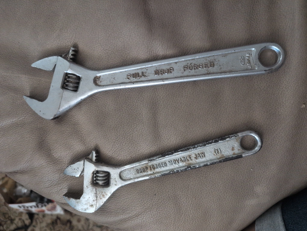 I'm selling a pair of adjustable wrenches. One is marked 'BULL DROP FORGED' and the other is marked 'JOB HELPER TAIWAN'. They both show signs of use but are still functional for various tasks