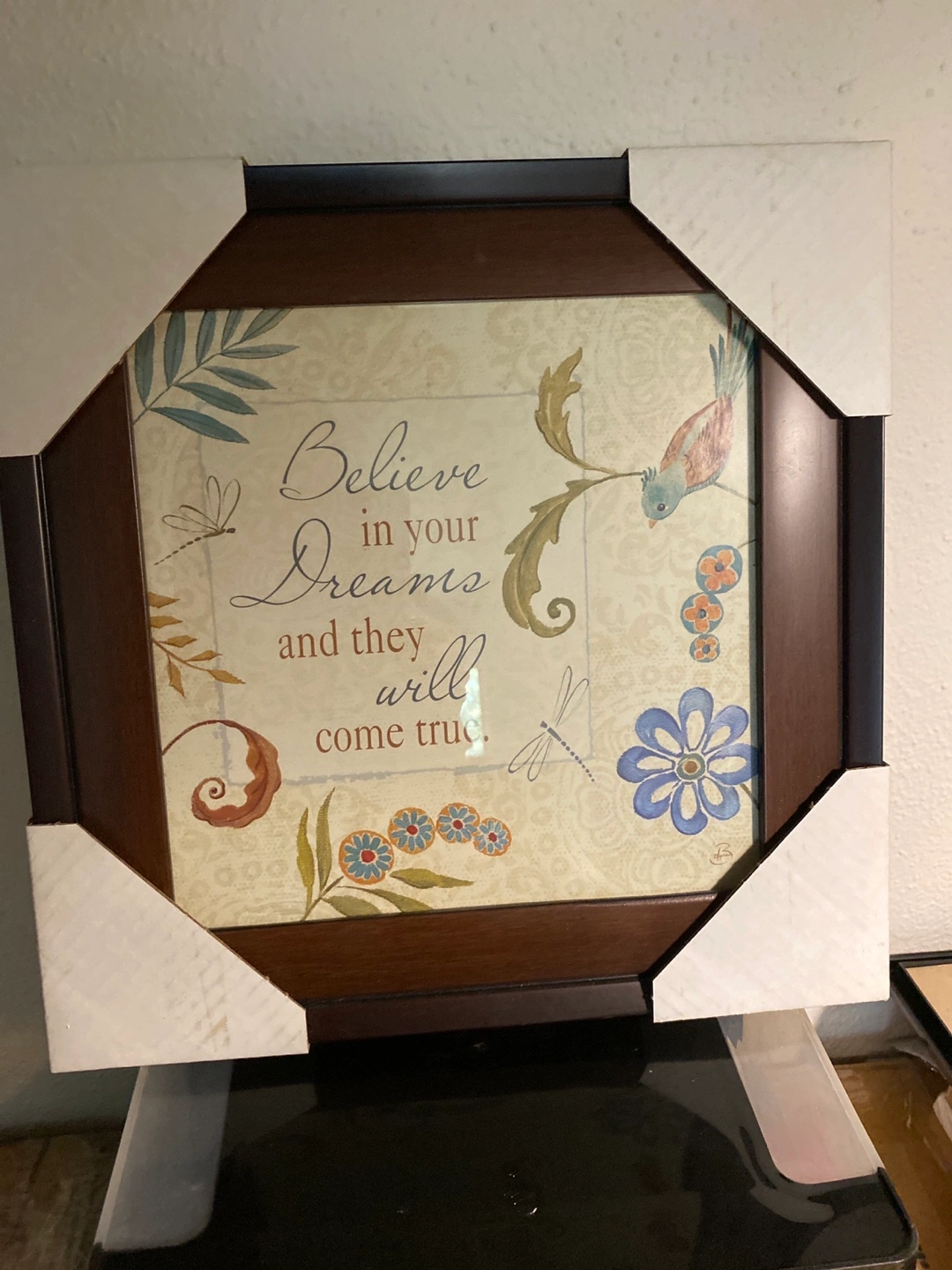 This framed wall art features a lovely design with the words "Believe in your dreams and they will come true". It's in great condition and ready to add a touch of inspiration to any room in your home Moving Sale