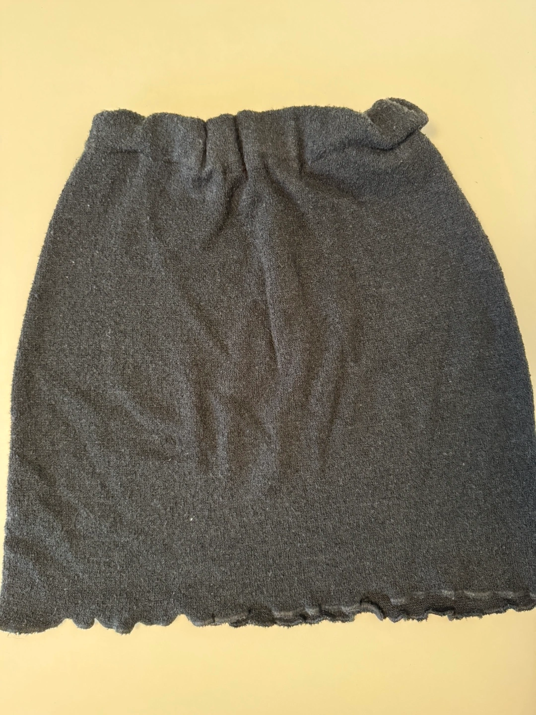 Here's a cute grey mini skirt! The skirt features a comfortable elastic waistband and a stylish, slightly scalloped hem. It's a versatile piece that can be dressed up or down!