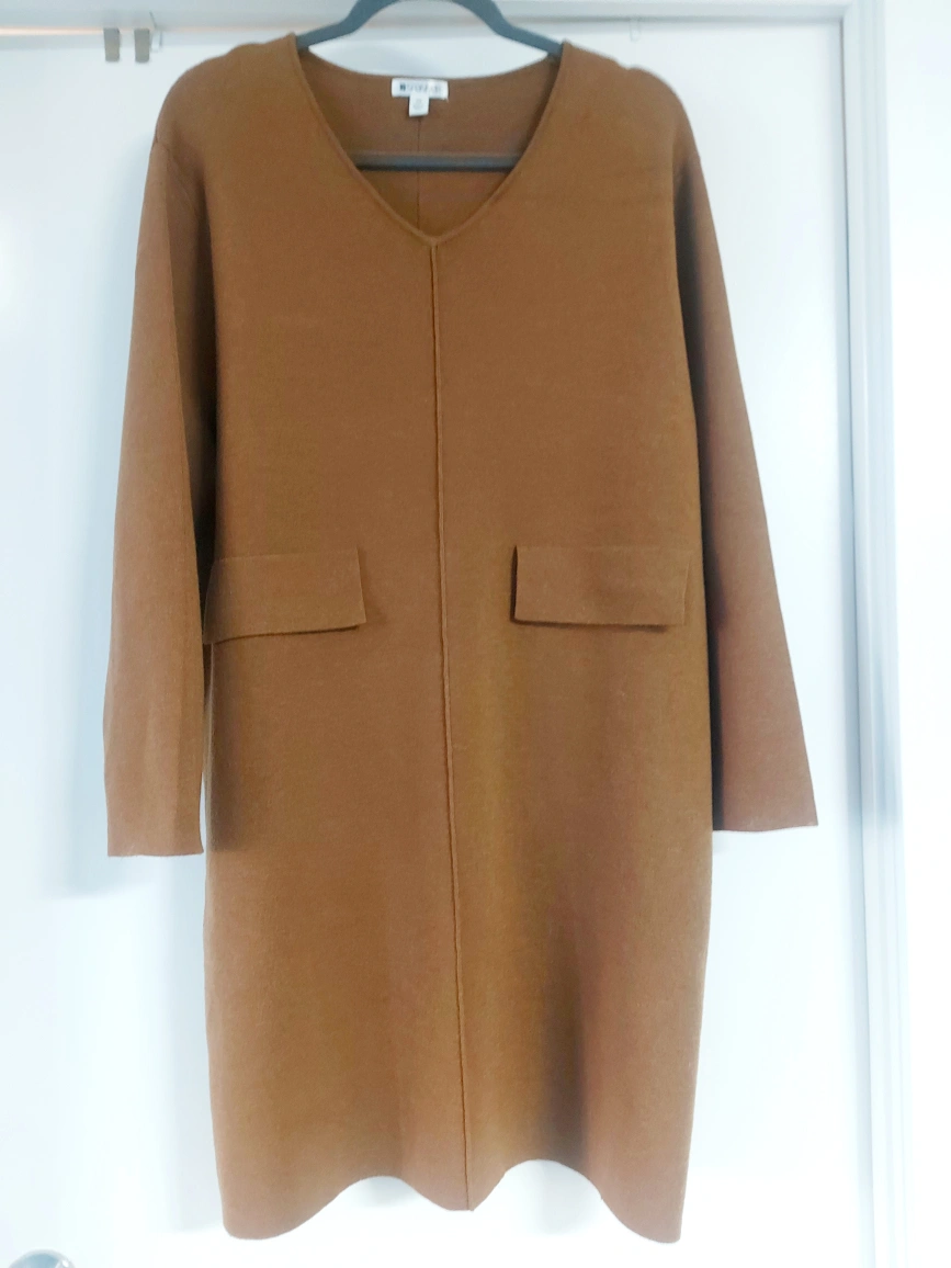 A lovely NEW brown knit dress from Spanner! It's in great condition and ready for a new home. The dress features a flattering V-neck and two handy pockets. Perfect for a casual day out or a cozy evening. Xl