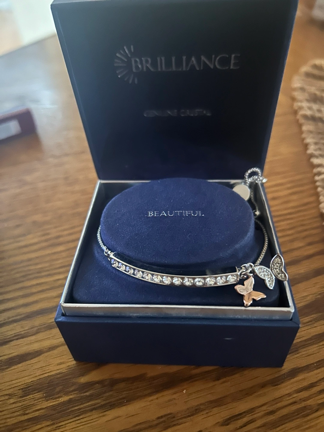 This is a beautiful Brilliance bracelet with butterfly charms and genuine crystals. It comes in its original box, making it perfect for gifting or treating yourself! The bracelet is in great condition and ready to add a touch of sparkle to your outfit