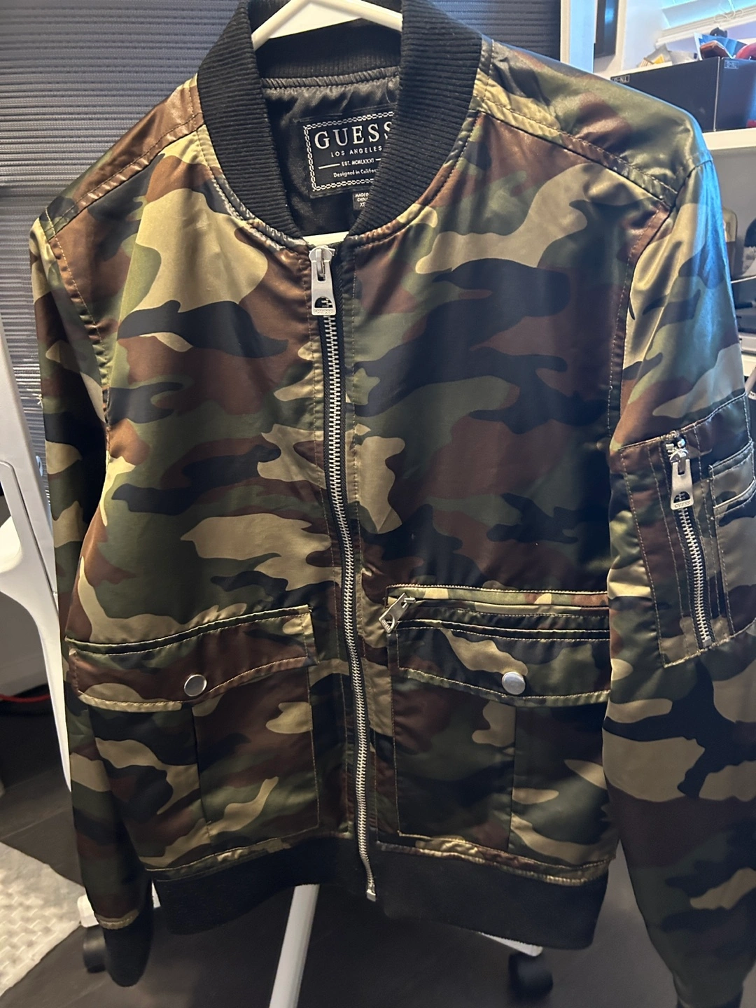 Here's a stylish Guess bomber jacket in a cool camo pattern! The size is XS. It's perfect for adding a bit of edge to your outfit.