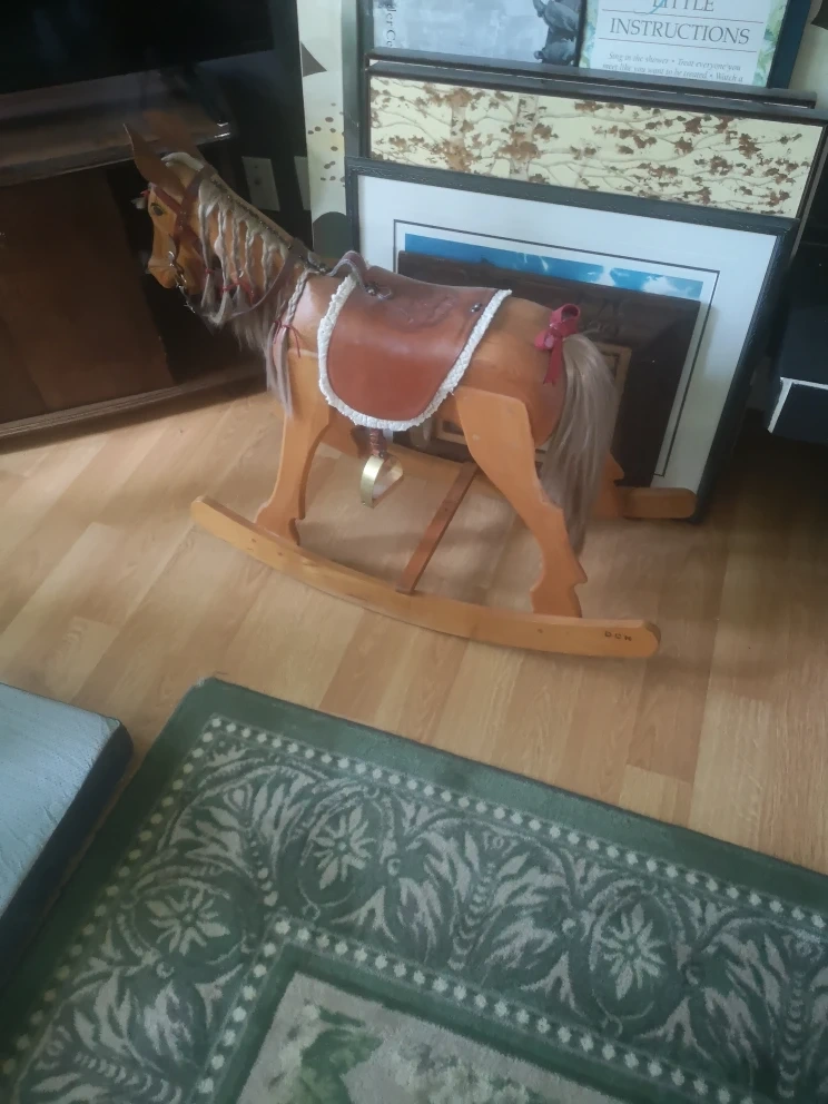 A charming vintage wooden rocking horse, perfect for a child's room or as a decorative piece! It has a classic design with a saddle and bridle. It's in good condition and ready for a new home