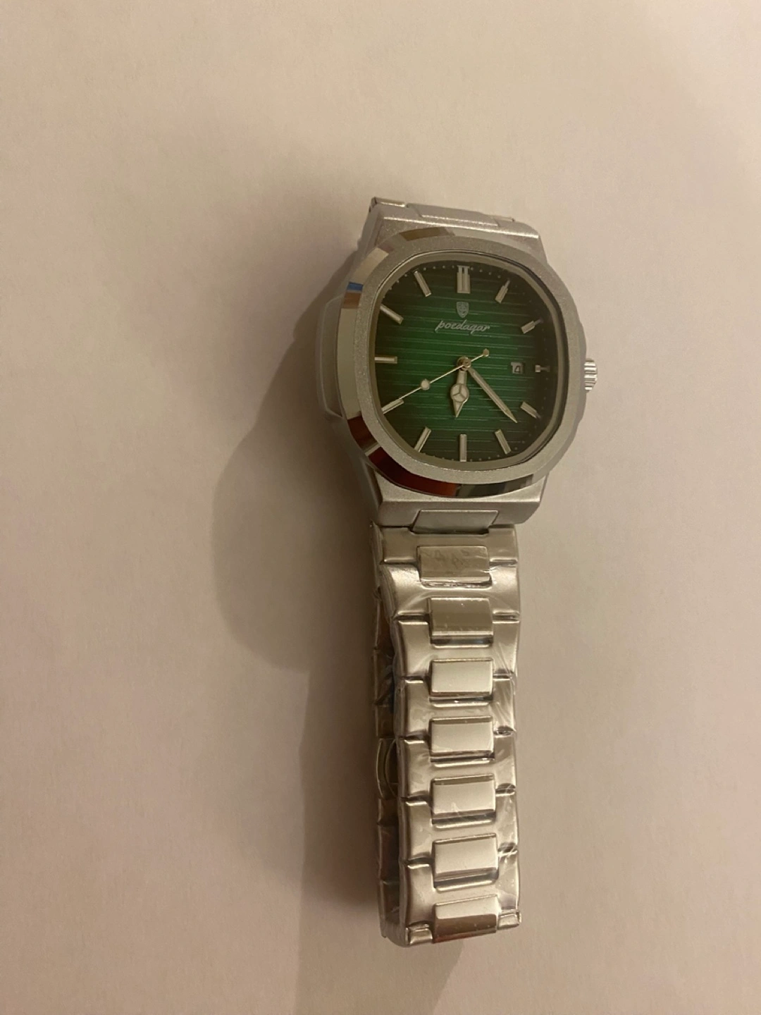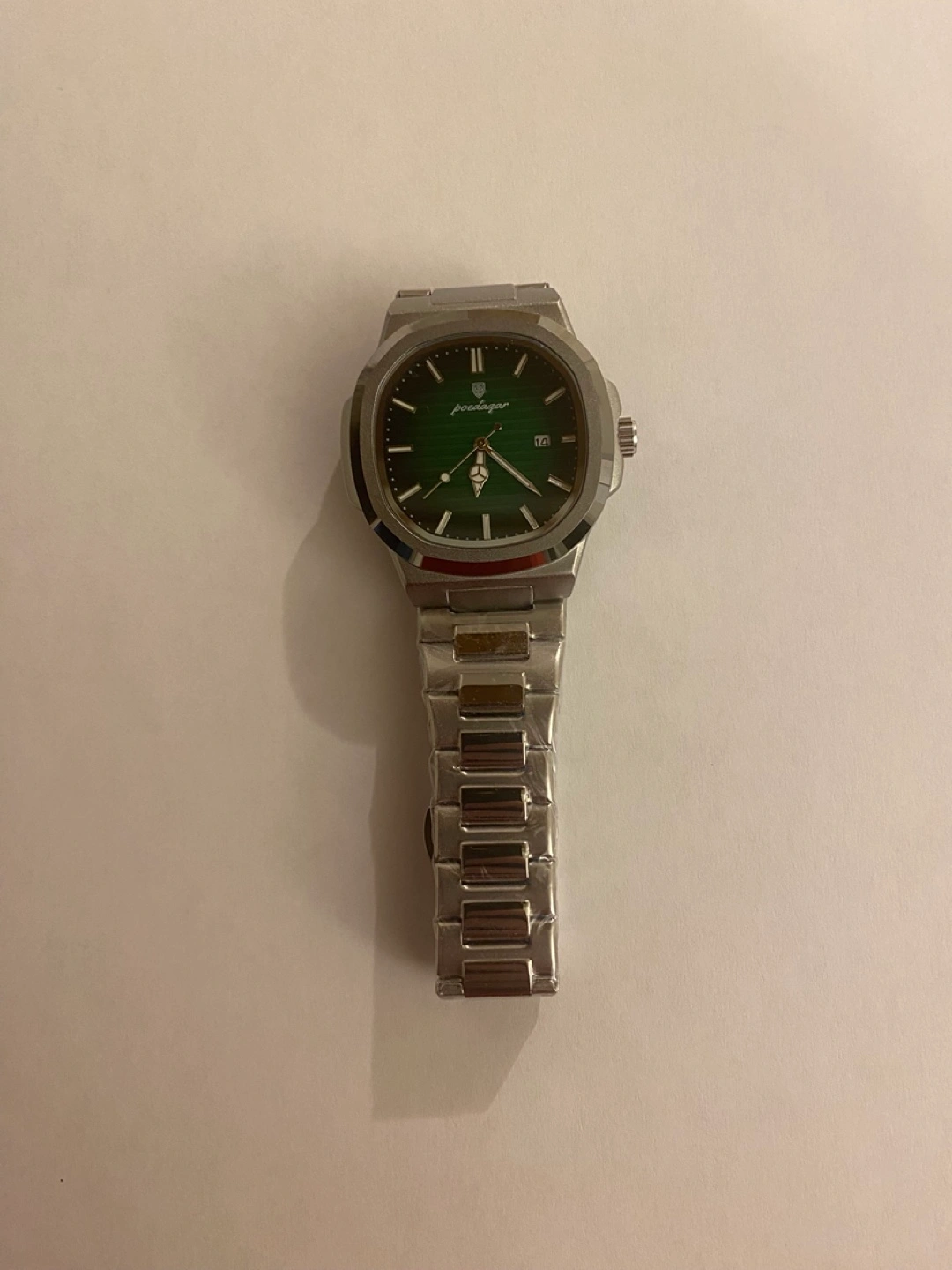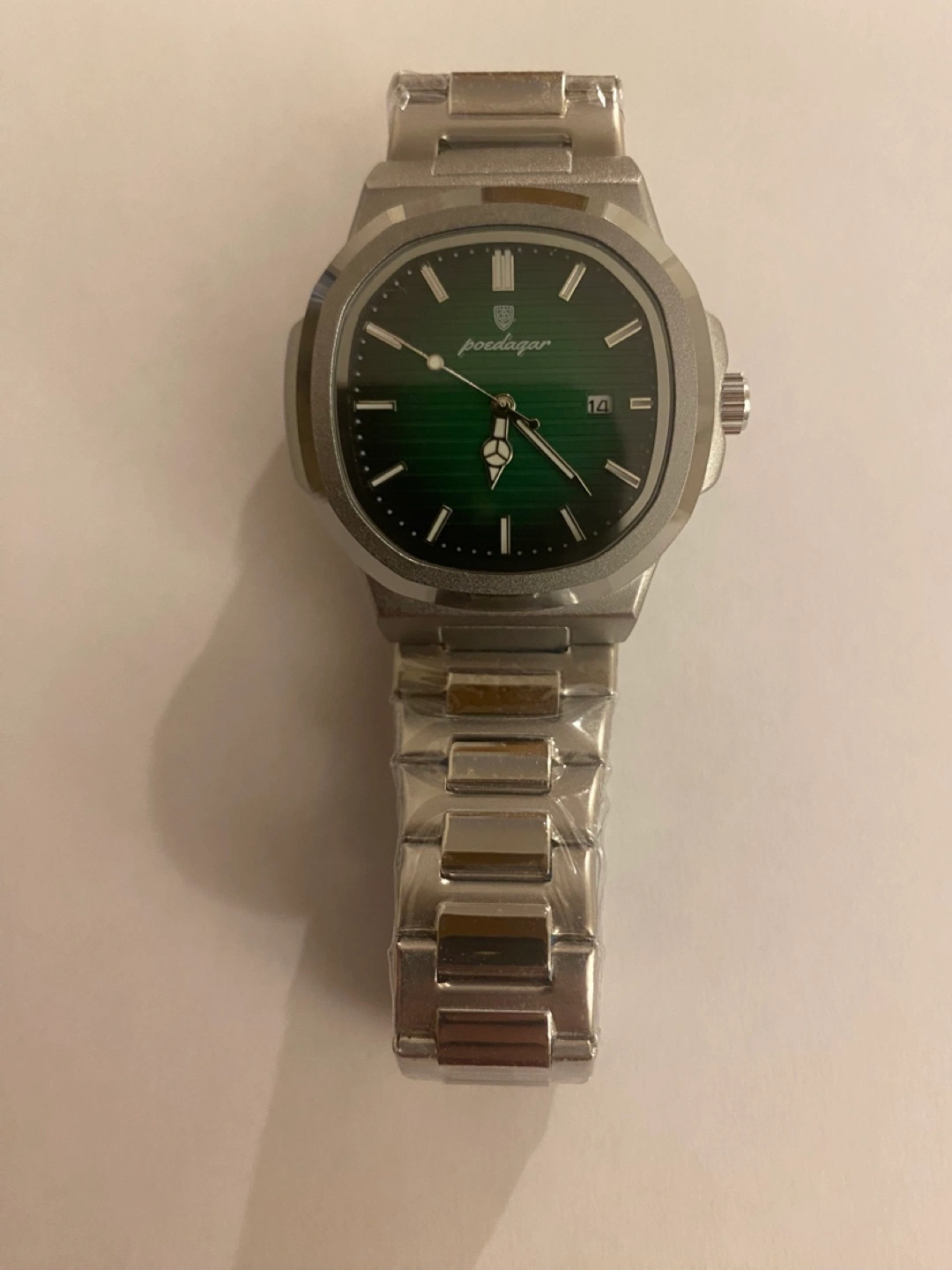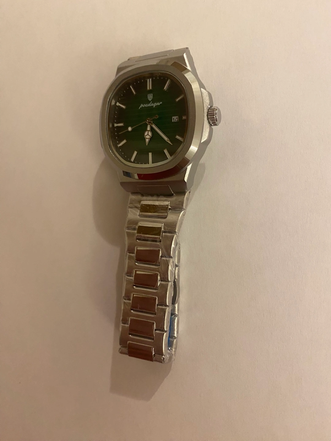 Selling a brand new Poedagar watch with a striking green dial and a sleek silver band! It's still in its original packaging, so you can be sure it's in perfect condition and ready to wear