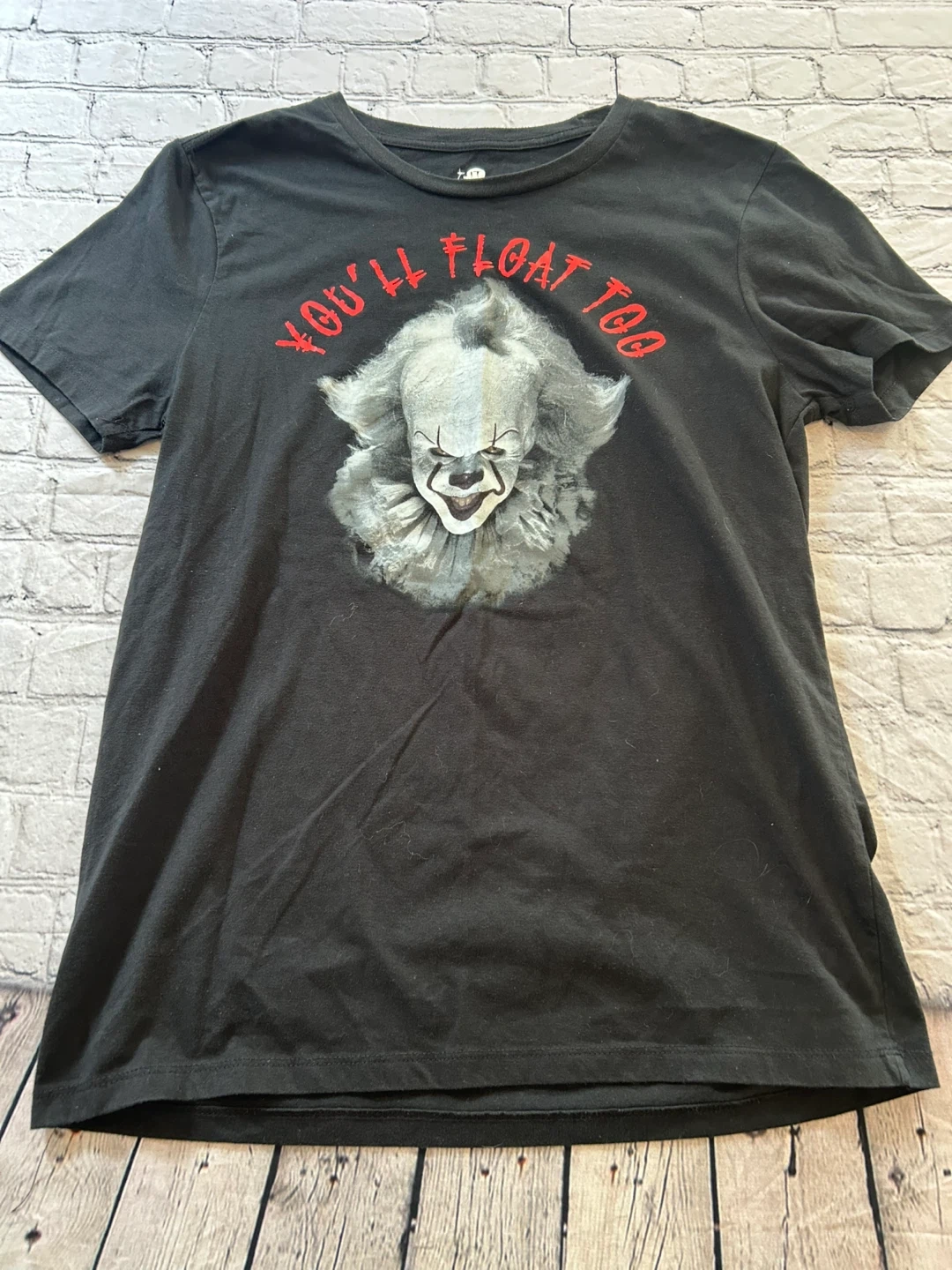 Selling a black t-shirt with a graphic from the movie "IT". The shirt features Pennywise and the text "You'll Float Too". It's in good used condition!