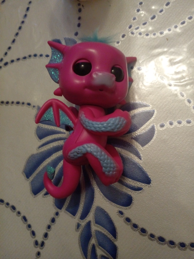 This is a cute pink dragon fingetling with blue accents. It's in good condition and ready for a new home!