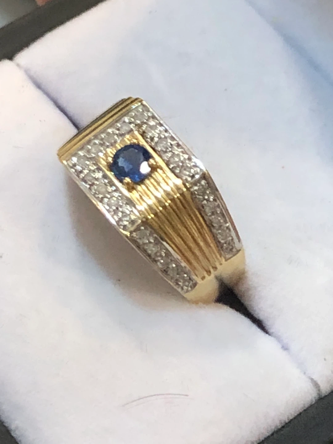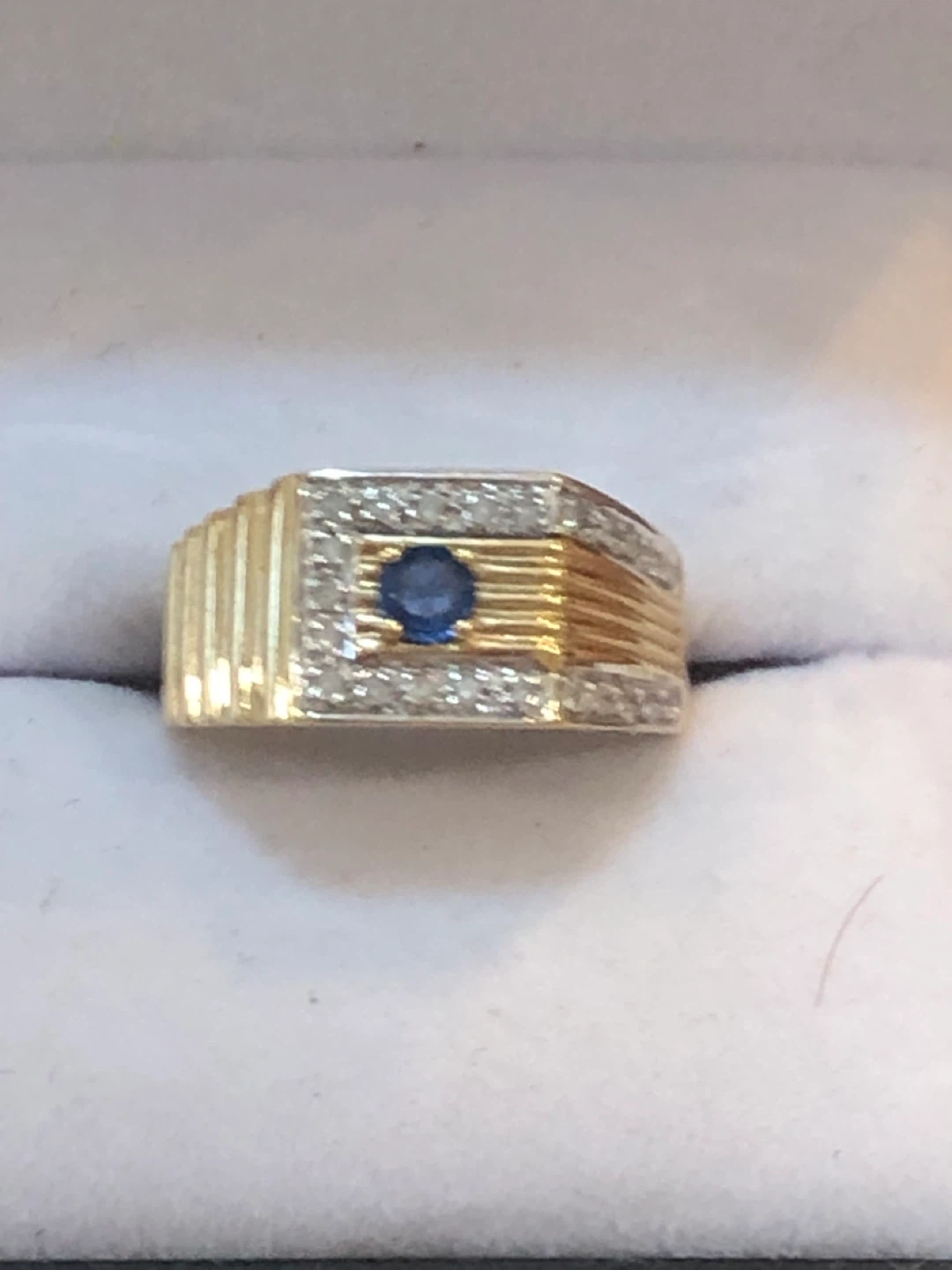 Selling a 10k yellow solid gold ring featuring a striking blue sapphire and diamonds . It's in New condition and ready for a new home. The ring has a unique design and is sure to catch the eye! make an offer .:)