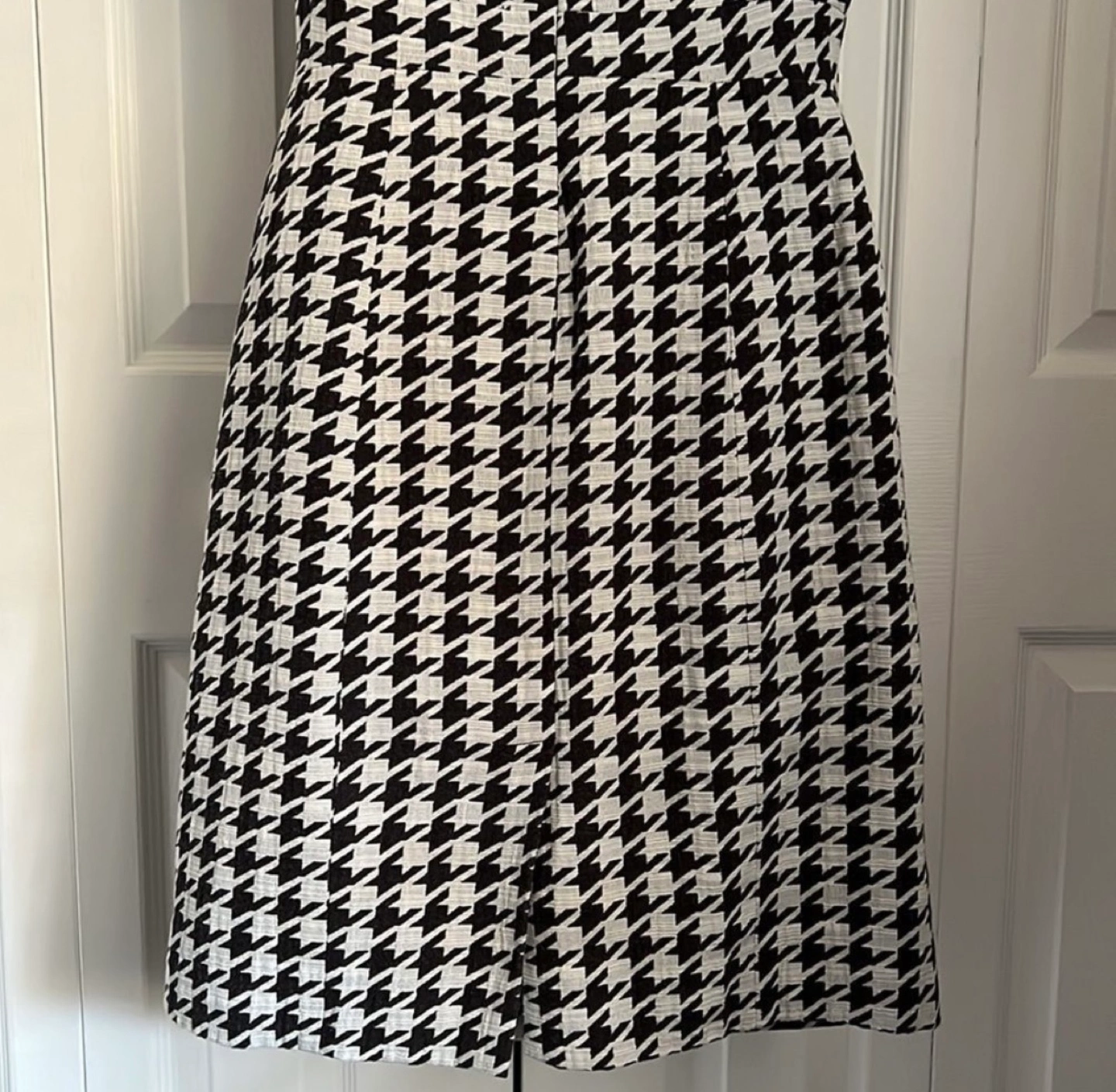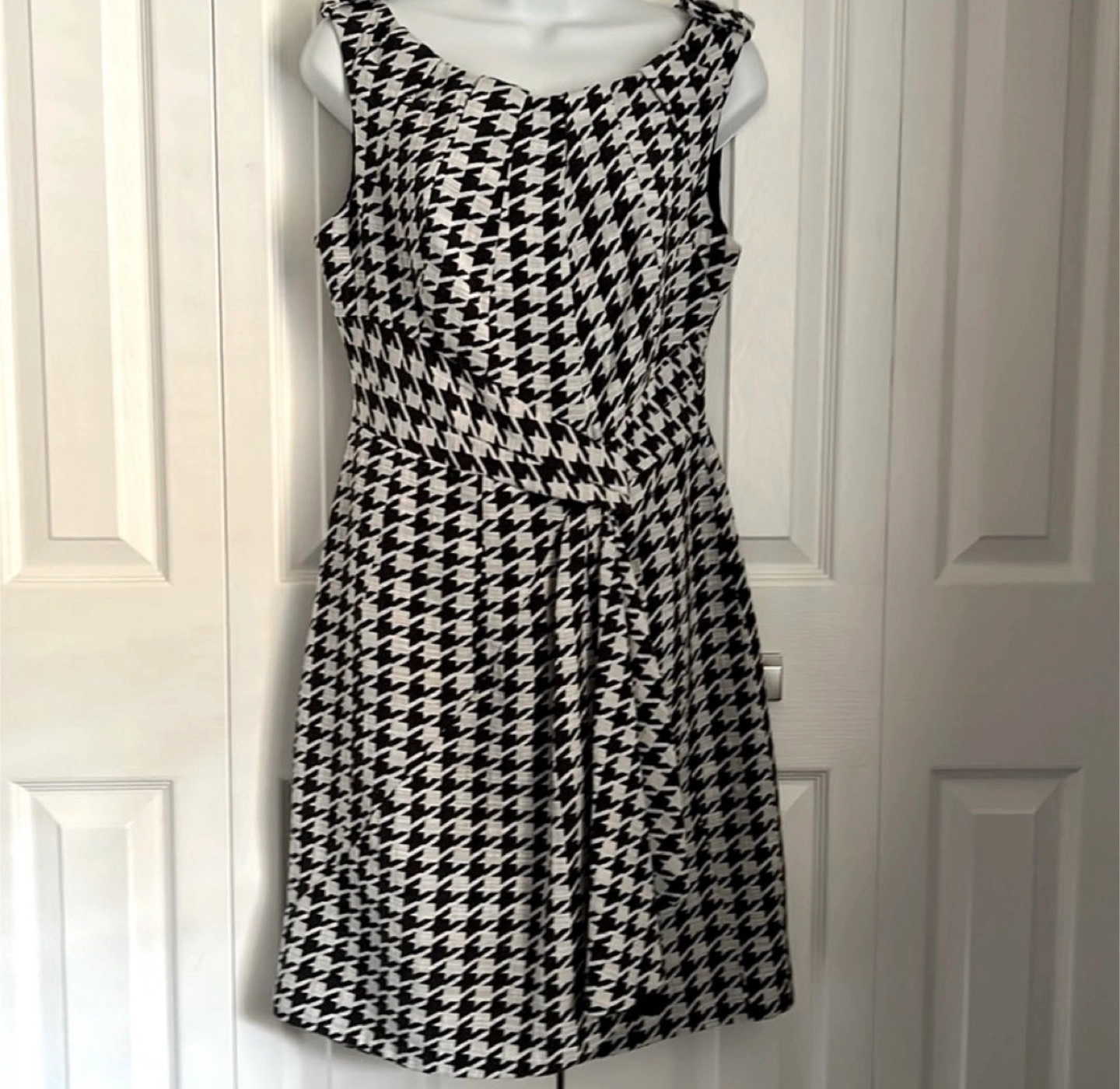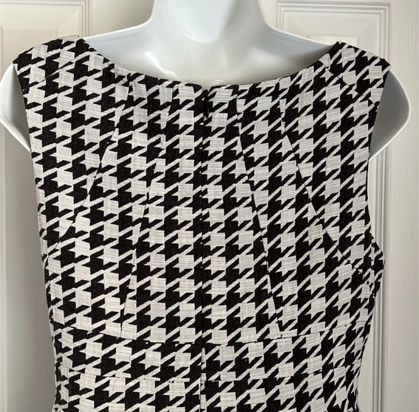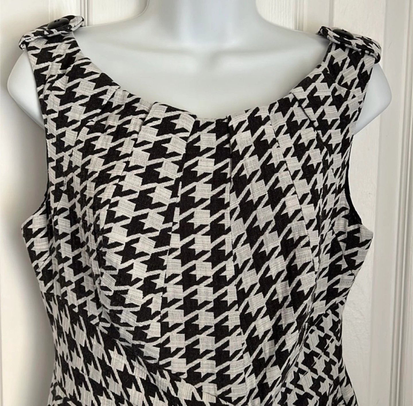 Selling a stylish black and white houndstooth dress! It's in great condition and features a classic pattern. Perfect for any occasion! Size M Sleeveless Large houndstooth pattern 7.5" back vent Tan and button detail on shoulders Front drape detail Box pleats at neckline Measurements laying flat: Armpit to armpit- 18" Waist- 14.5" Shoulder to hem-36" From pet and smoke free home. Pickup near Masonville mall :)