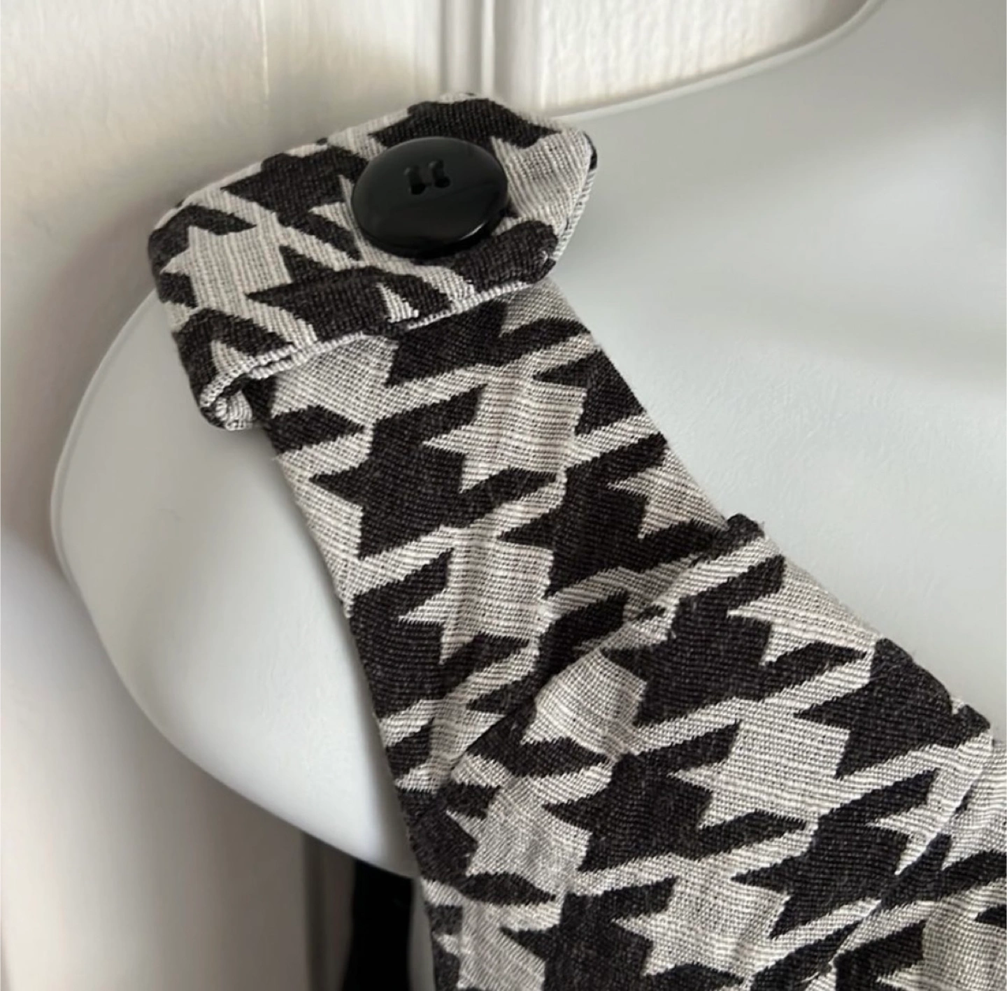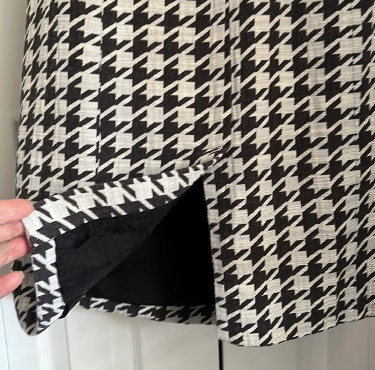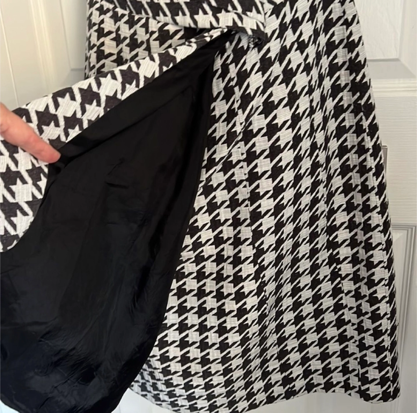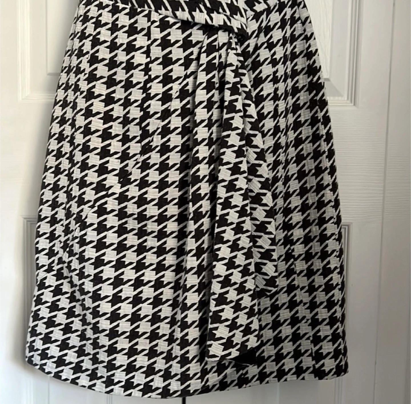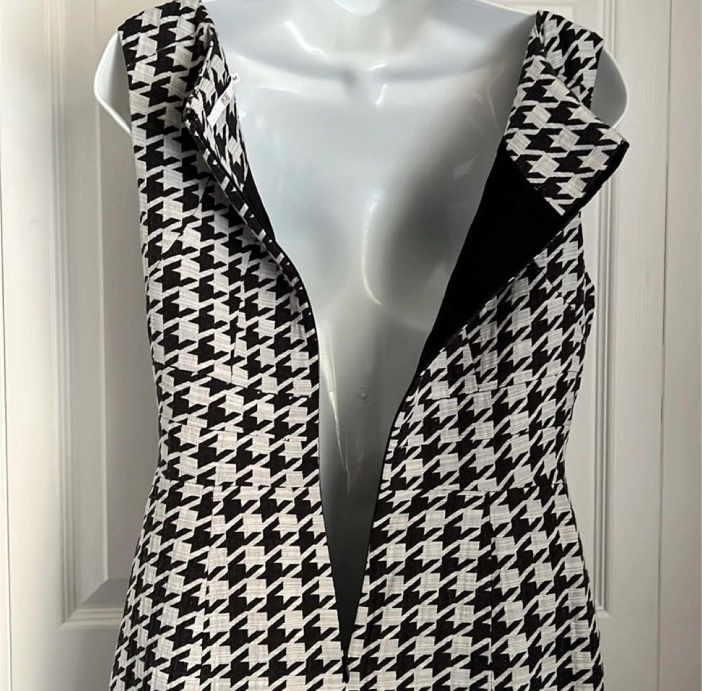 Selling a stylish black and white houndstooth dress! It's in great condition and features a classic pattern. Perfect for any occasion! Size M Sleeveless Large houndstooth pattern 7.5" back vent Tan and button detail on shoulders Front drape detail Box pleats at neckline Measurements laying flat: Armpit to armpit- 18" Waist- 14.5" Shoulder to hem-36" From pet and smoke free home. Pickup near Masonville mall :)