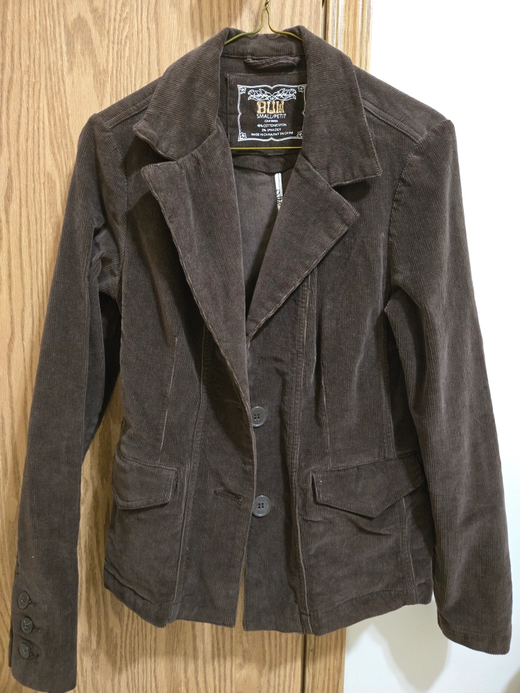 Here's a Bluenotes corduroy blazer in a size Small/Petit! It's made of 98% cotton and 2% spandex. It's in great condition and ready for a new home!
