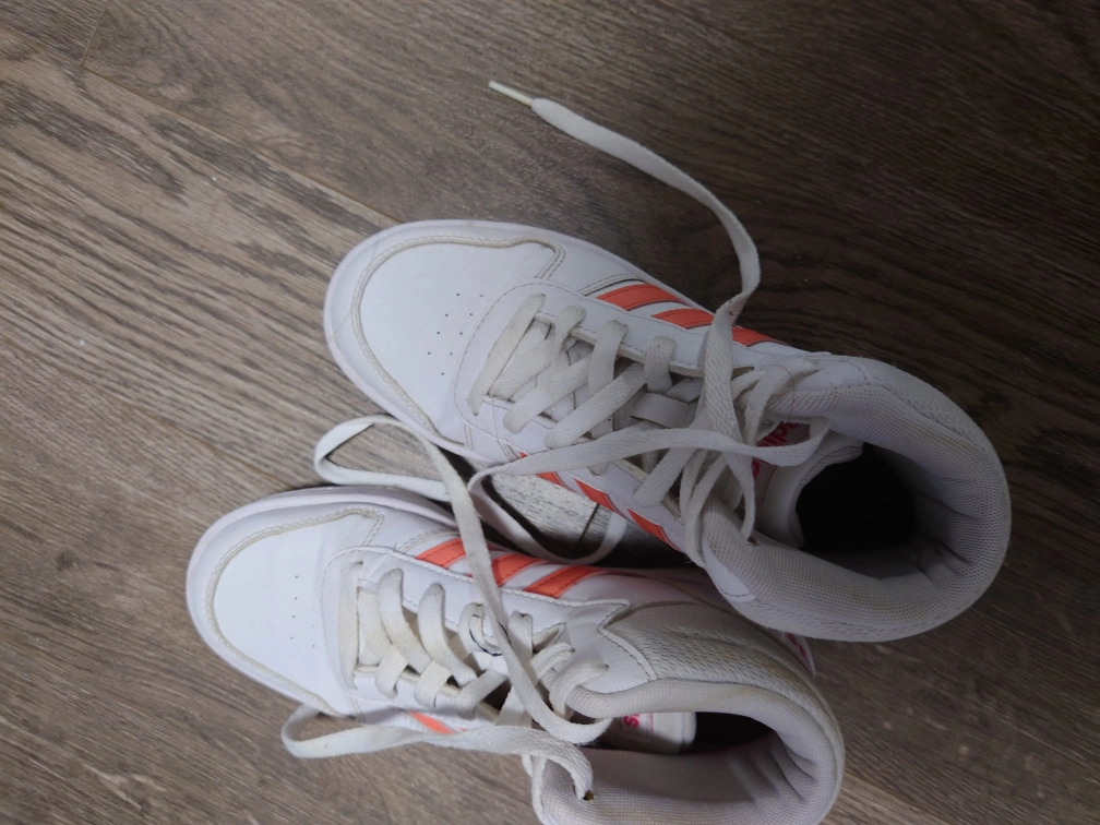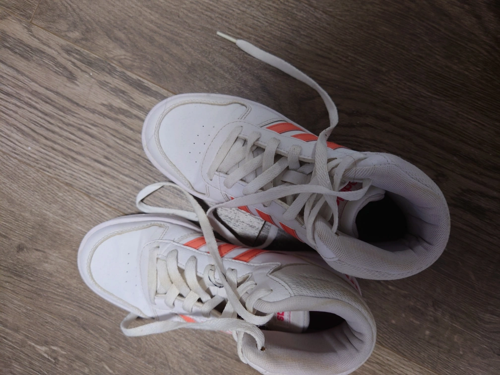 These Adidas Hoops great condition and ready for a new home! They feature the classic Adidas stripes in a vibrant coral colour on a clean white base. Perfect for everyday wear or hitting the court!