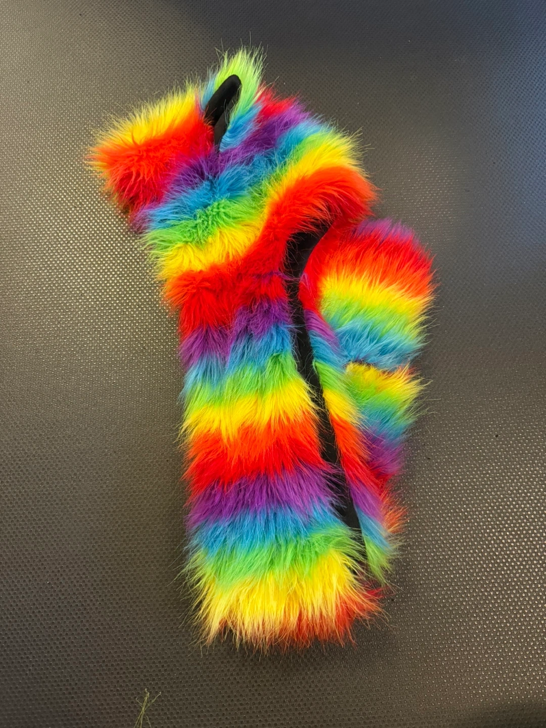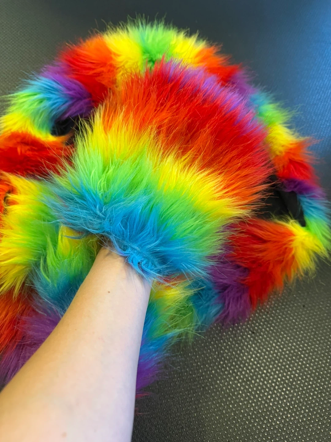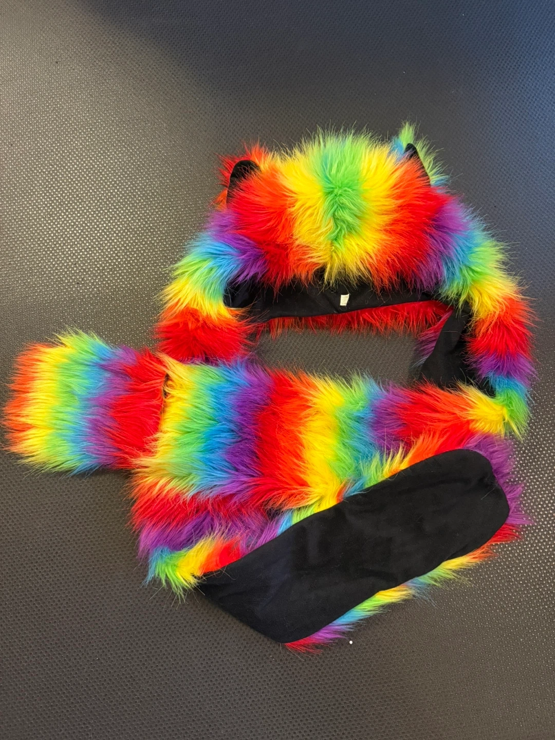 Check out this unique rainbow faux fur hood scarf with attached mittens! It's super colourful and cozy, perfect for adding some fun to your winter wardrobe. It's in great condition and ready for a new home!
