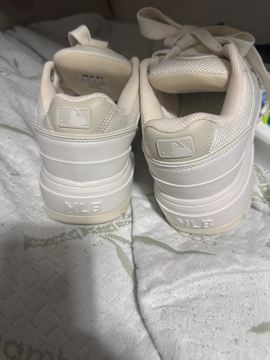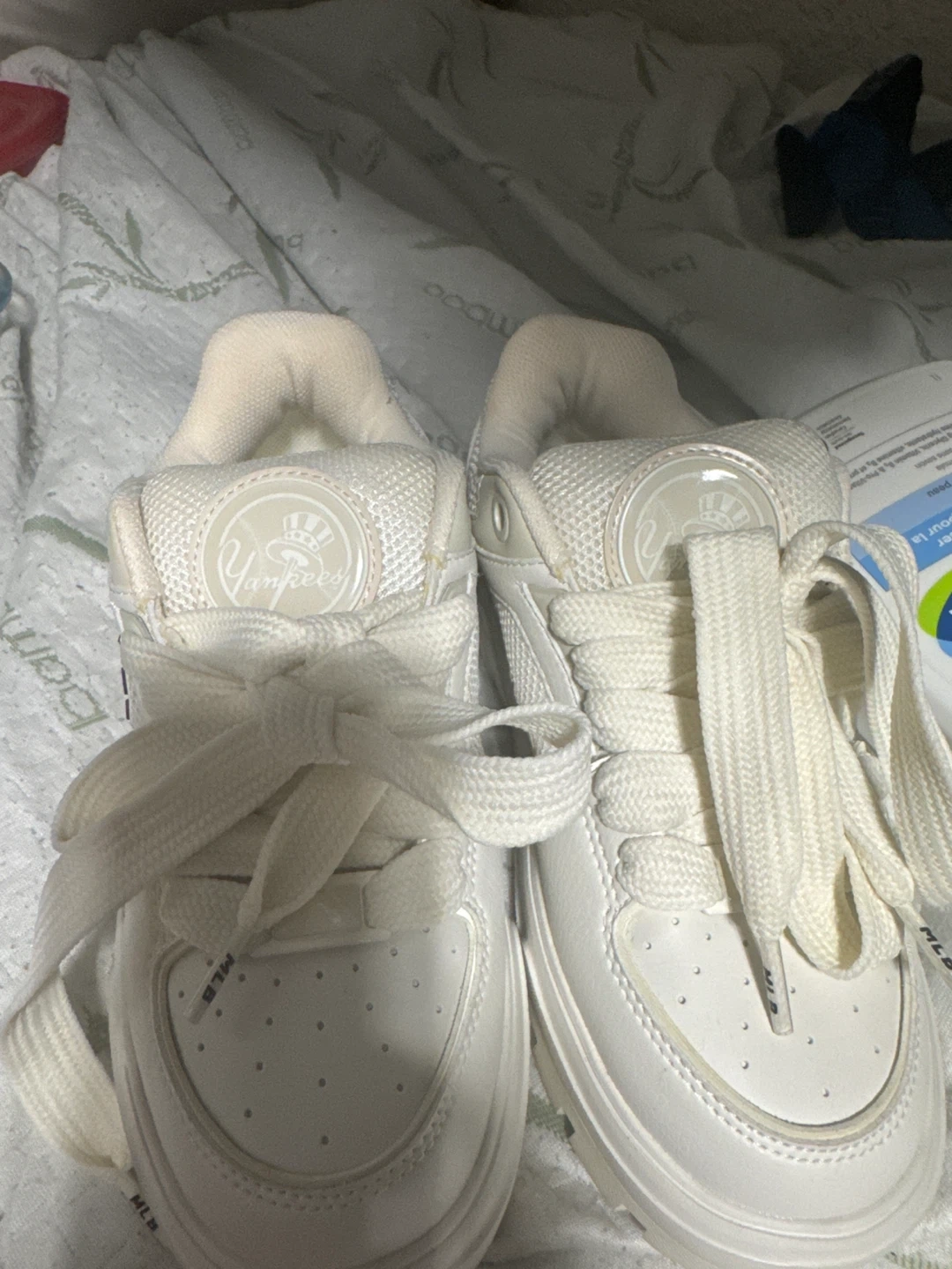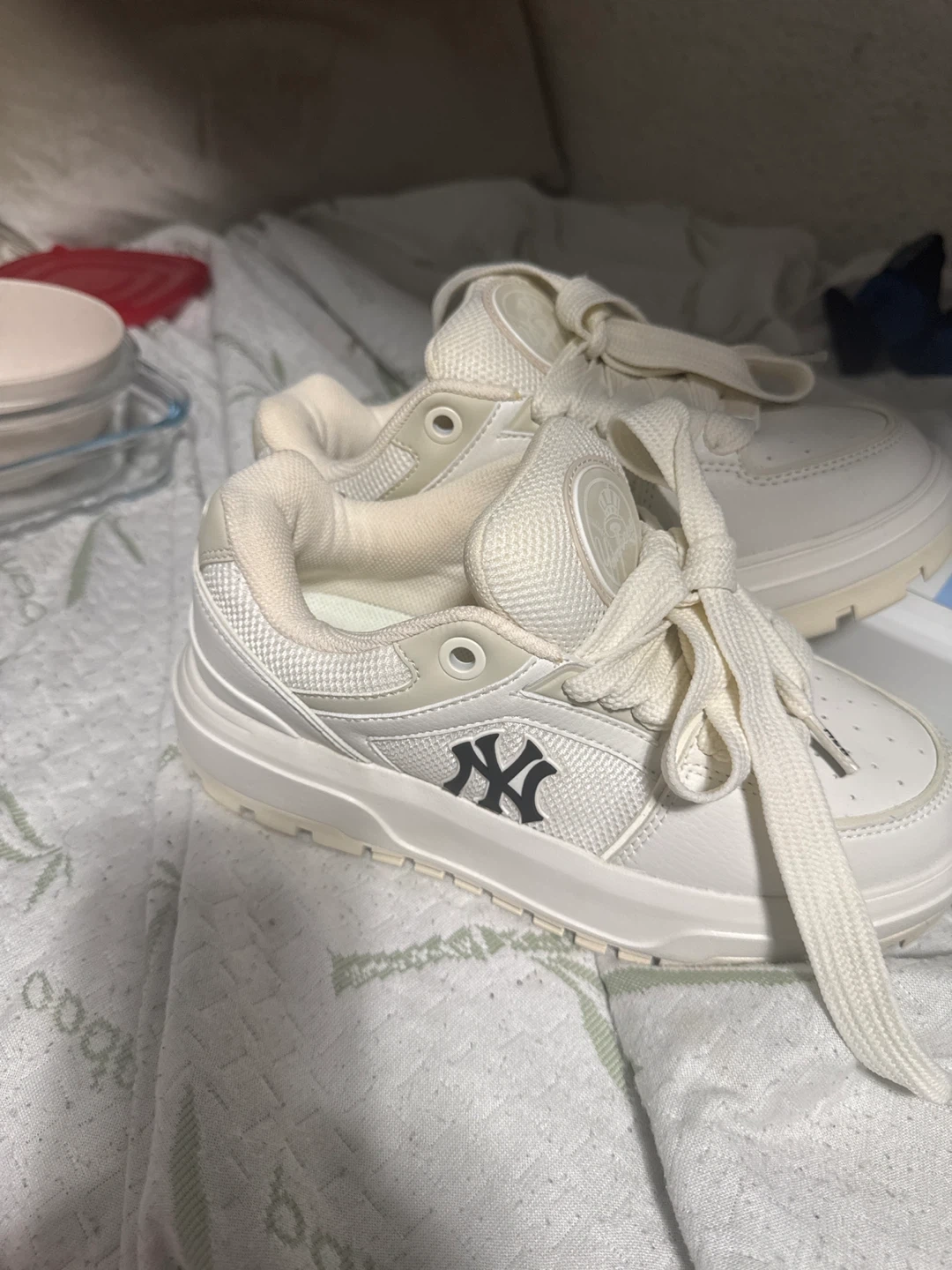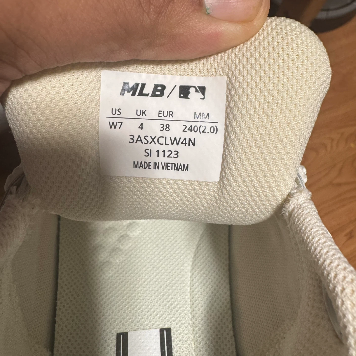 Selling a pair of MLB Yankees sneakers in white. They're in great condition and a size 7 in women's. These sneakers are super stylish and comfortable, perfect for everyday wear! The size is US W7, UK 4, EUR 38, and MM 240(2.0)