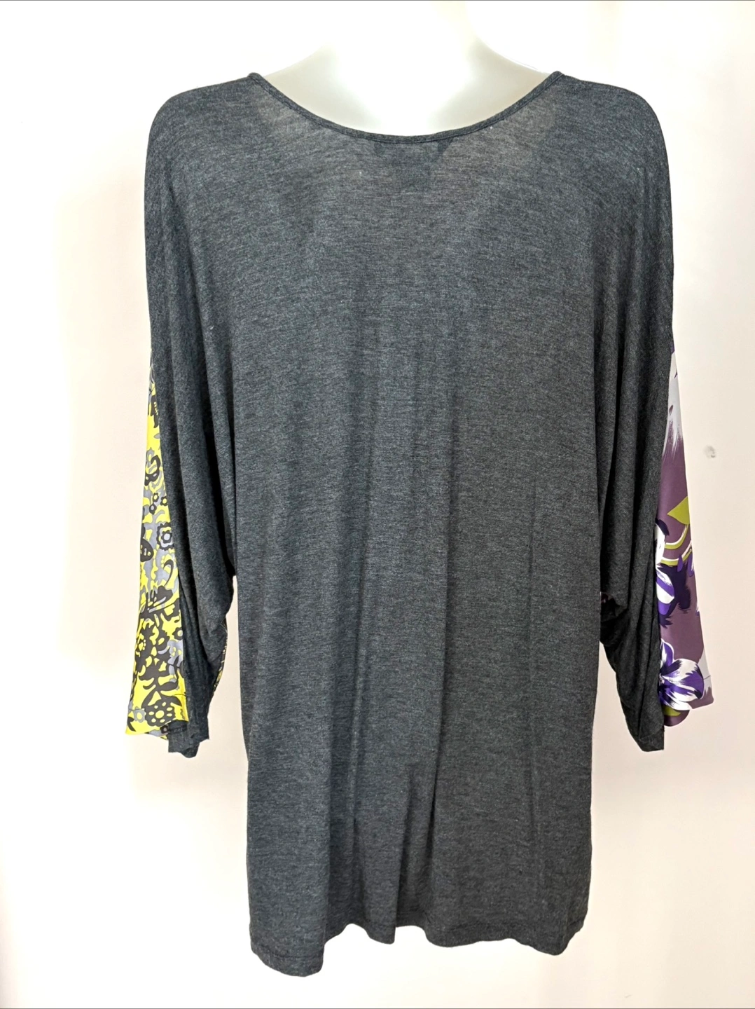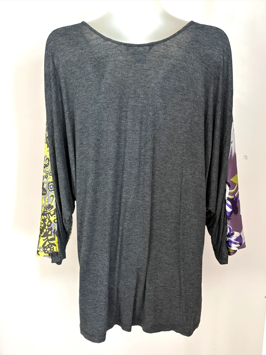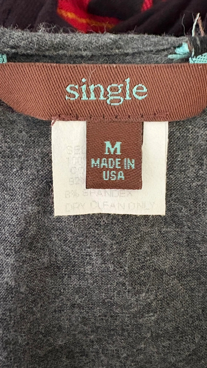 Here's a stylish top from Single! It's a size medium and features a unique design with floral patterned sleeves. The main material is silk, rayon, and spandex blend, making it super comfy. Perfect for adding a pop of colour to your wardrobe!