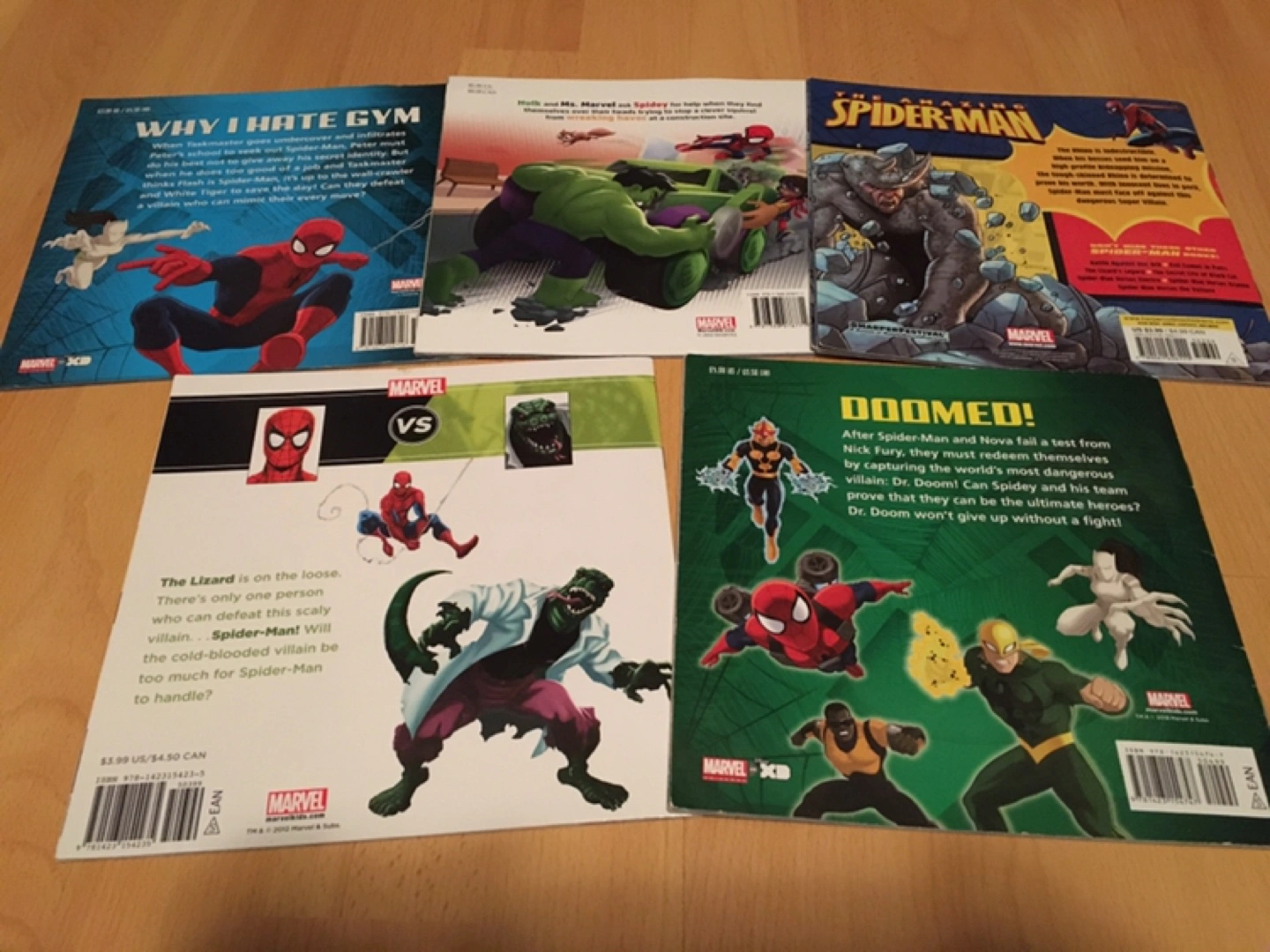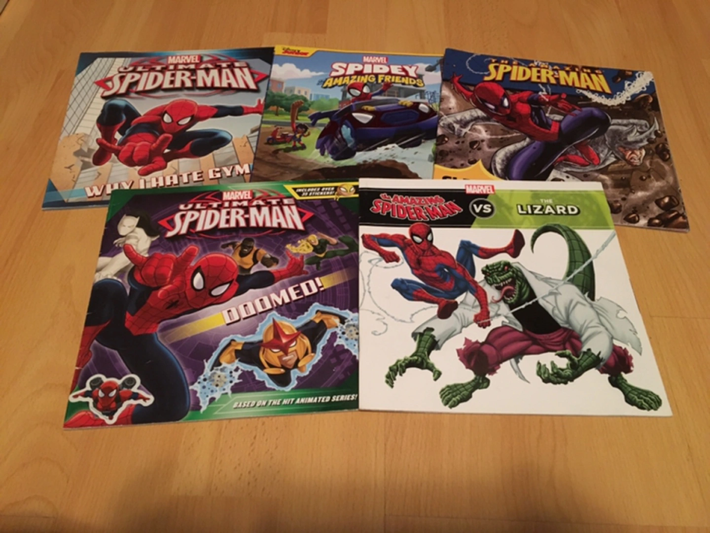 Selling 5 Marvel Spider-Man books for kids. Great for young readers who love superheroes and action-packed stories. Selling all 5 books for $10.