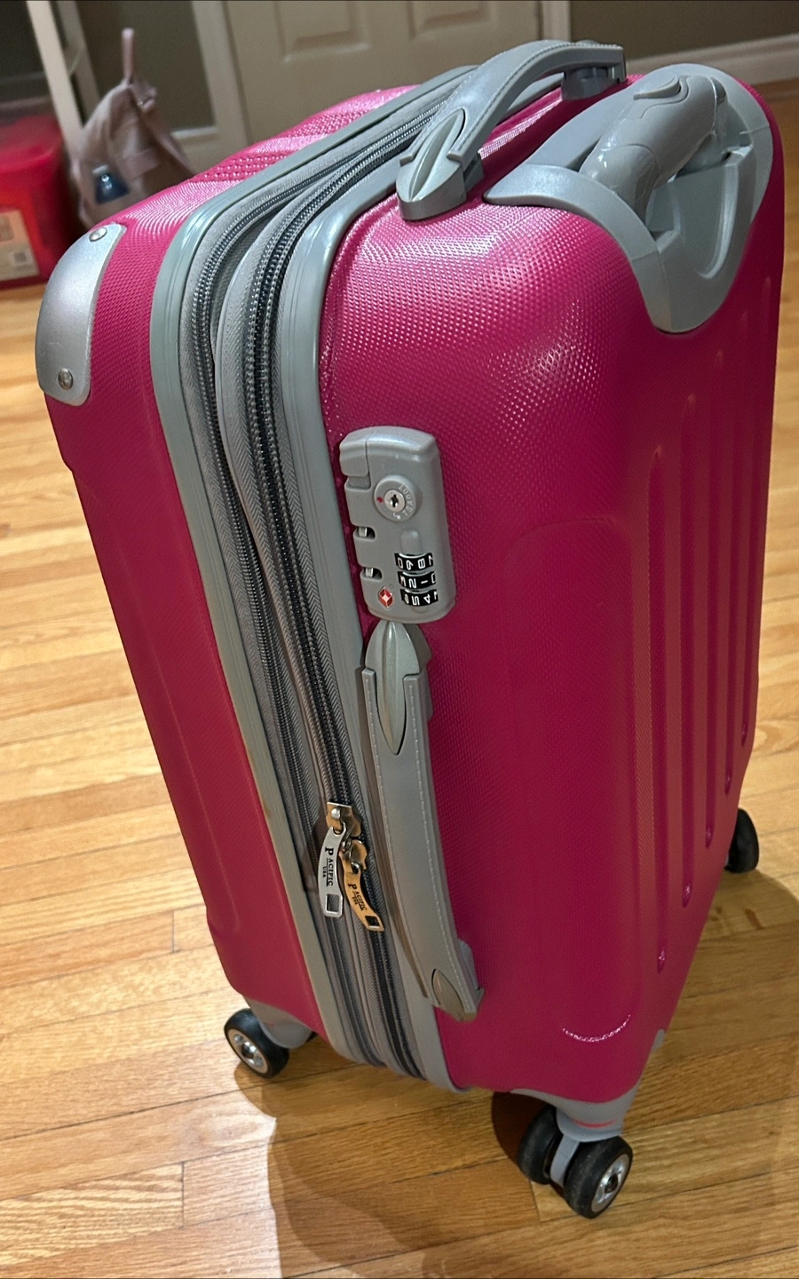 Selling a used Pacific USA carry-on suitcase in a vibrant pink colour. Has a combination lock and smooth-rolling wheels. Measurements are approximately 14.5 inches x 9.5 inches x 22 inches, wheels and handles included.