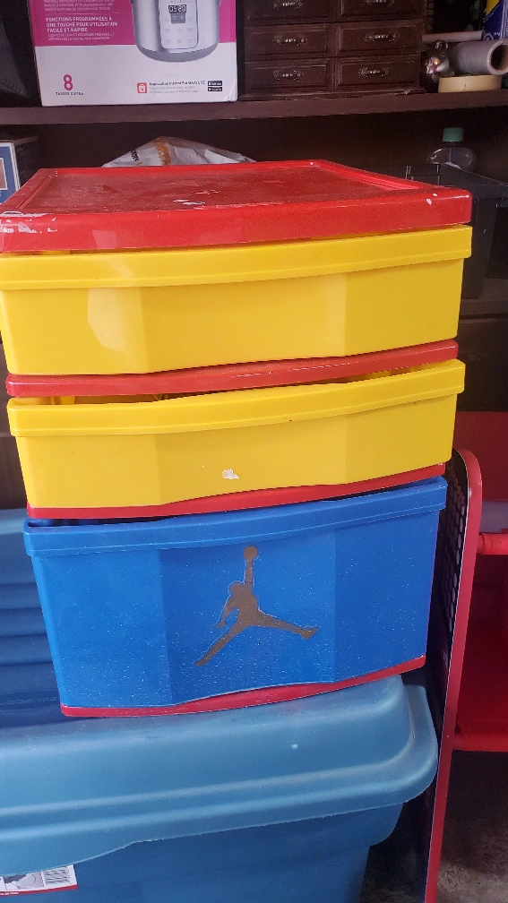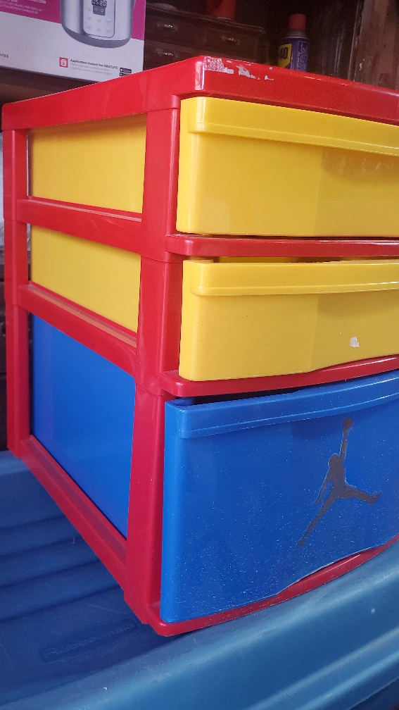 Kids' storage drawer .The unit has three drawers in total, with red, yellow, and blue colours. Good for organizing toys or clothes!🥕🥕🥕