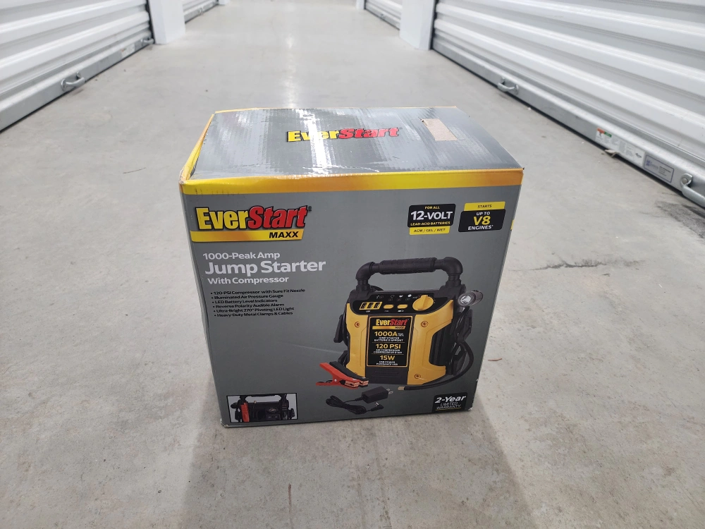Selling an EverStart Maxx 1000-Peak Amp Jump Starter with Compressor! It's suitable for all 12-volt lead-acid batteries and starts up to V8 engines. It also features a 120-PSI compressor with a Sure Fit Nozzle, LED battery level indicators, and reverse polarity audible alarm