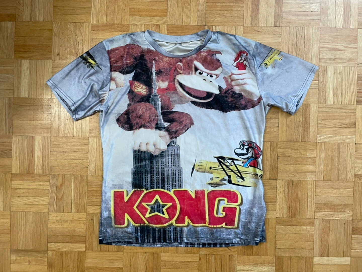 Here's a fun Donkey Kong graphic t-shirt! The design features Donkey Kong, Mario, and other elements from the classic video game. It's perfect for any Nintendo fan!