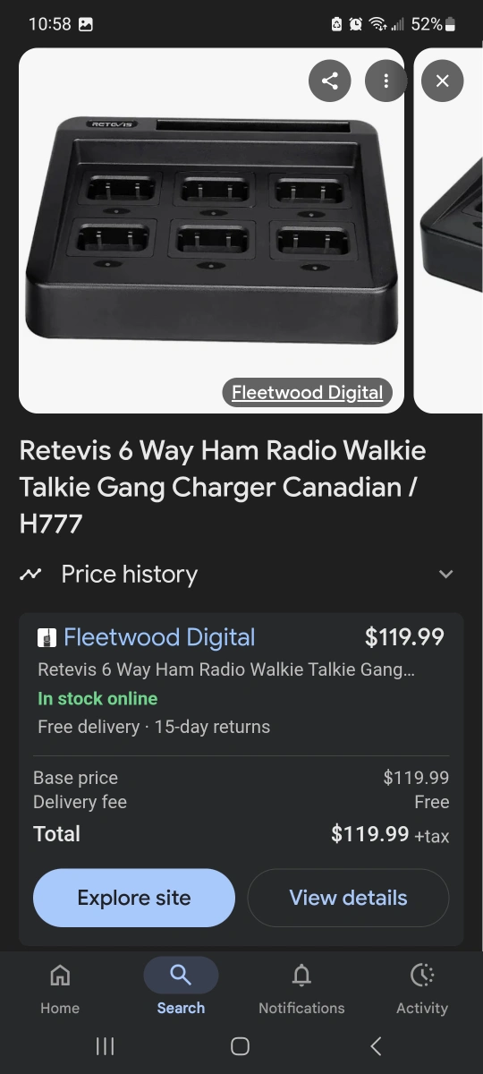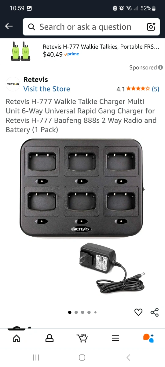 Selling a Retevis 6-way charger for ham radios and walkie talkies. It's a universal rapid gang charger compatible with Retevis H-777 and Baofeng 888s 2-way radios and batteries. It comes with the adapter.