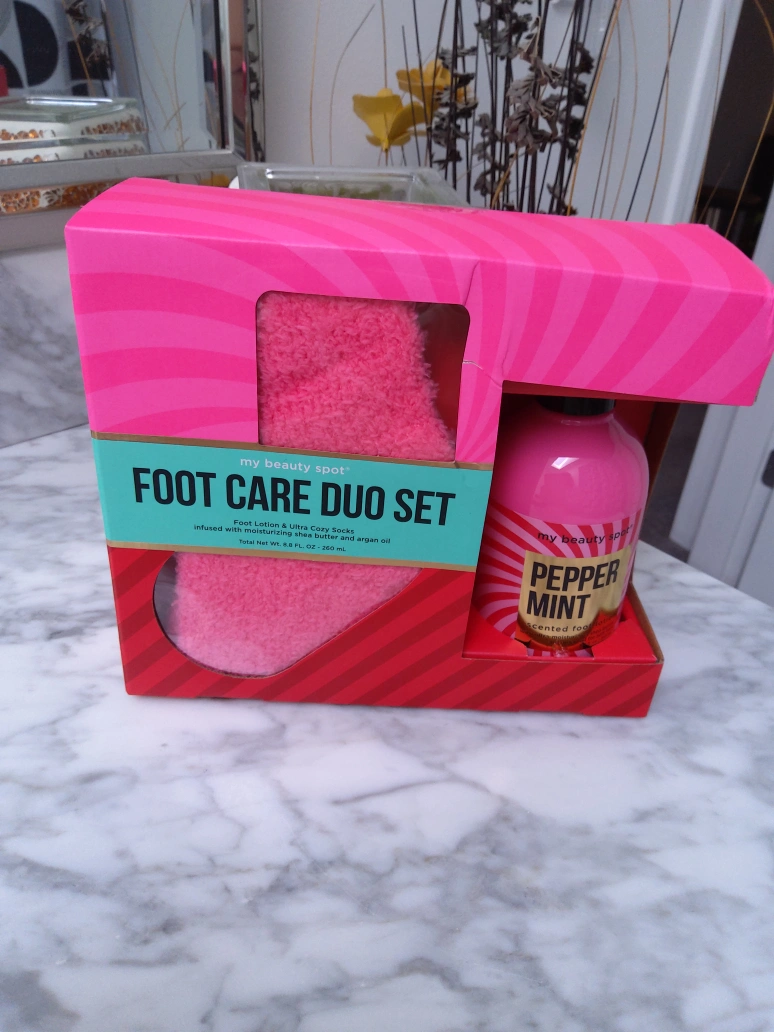 Selling a My Beauty Spot Foot Care Duo Set. This set includes foot lotion and ultra cozy socks, infused with moisturizing shea butter and argan oil. It also includes pepper mint scented foot lotion