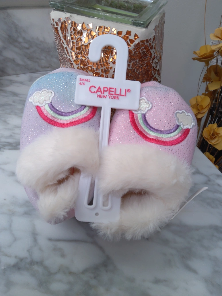 Super cute Capelli New York slippers! These feature adorable rainbow designs and a soft, fluffy trim. Size is small, which fits a 4/5. Perfect for keeping little feet cozy!