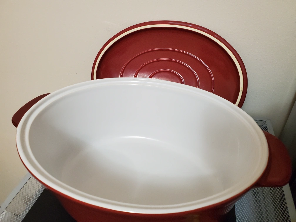 Selling a KitchenAid casserole dish in great condition! It's a lovely red colour and holds 3 quarts (2.8 L). It's microwave, oven, and dishwasher safe, making it super convenient for all your cooking needs. Comes with the lid and care instructions too