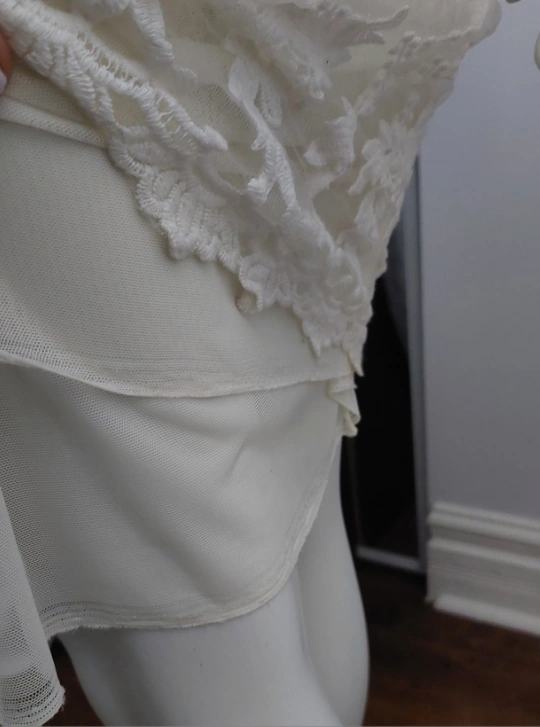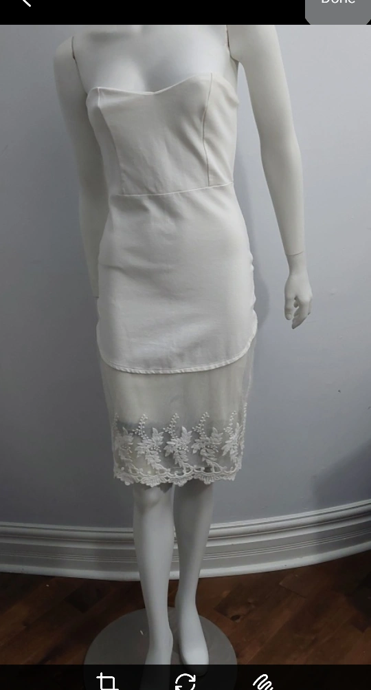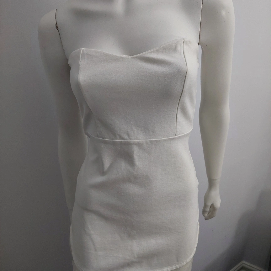 This is a cute white strapless mini dress! It has a unique design with a semi-sheer lace hem.There are semi-sheer layers. It's in great condition and would be perfect for a night out or a special occasion. Looks great with jeans jacket ๐. This item was recently washed, steamed , or pressed. DISCOUNTS applies on multiple purchases on bundling.