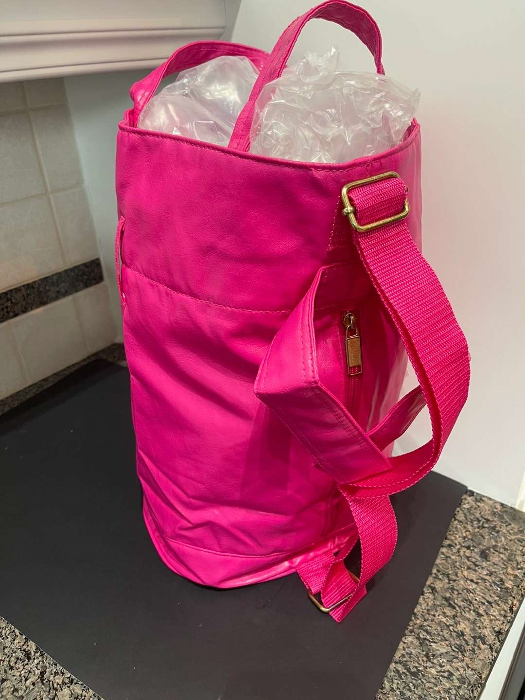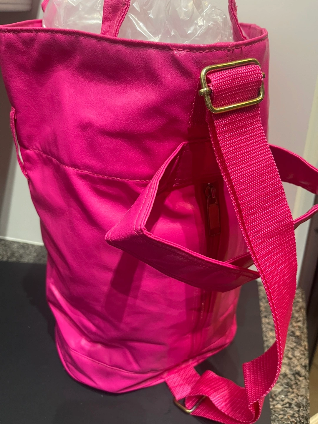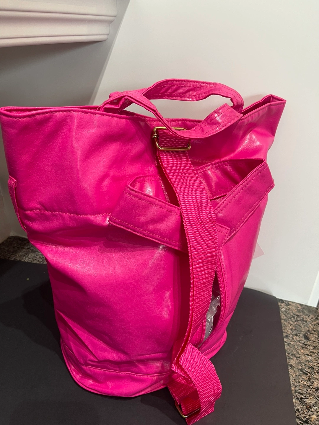 Selling a very cute very light weight hot pink tote bag - new - never used. It features a zipper pocket on the side and an adjustable shoulder strap plus 2 handles. Perfect for school or everyday use.