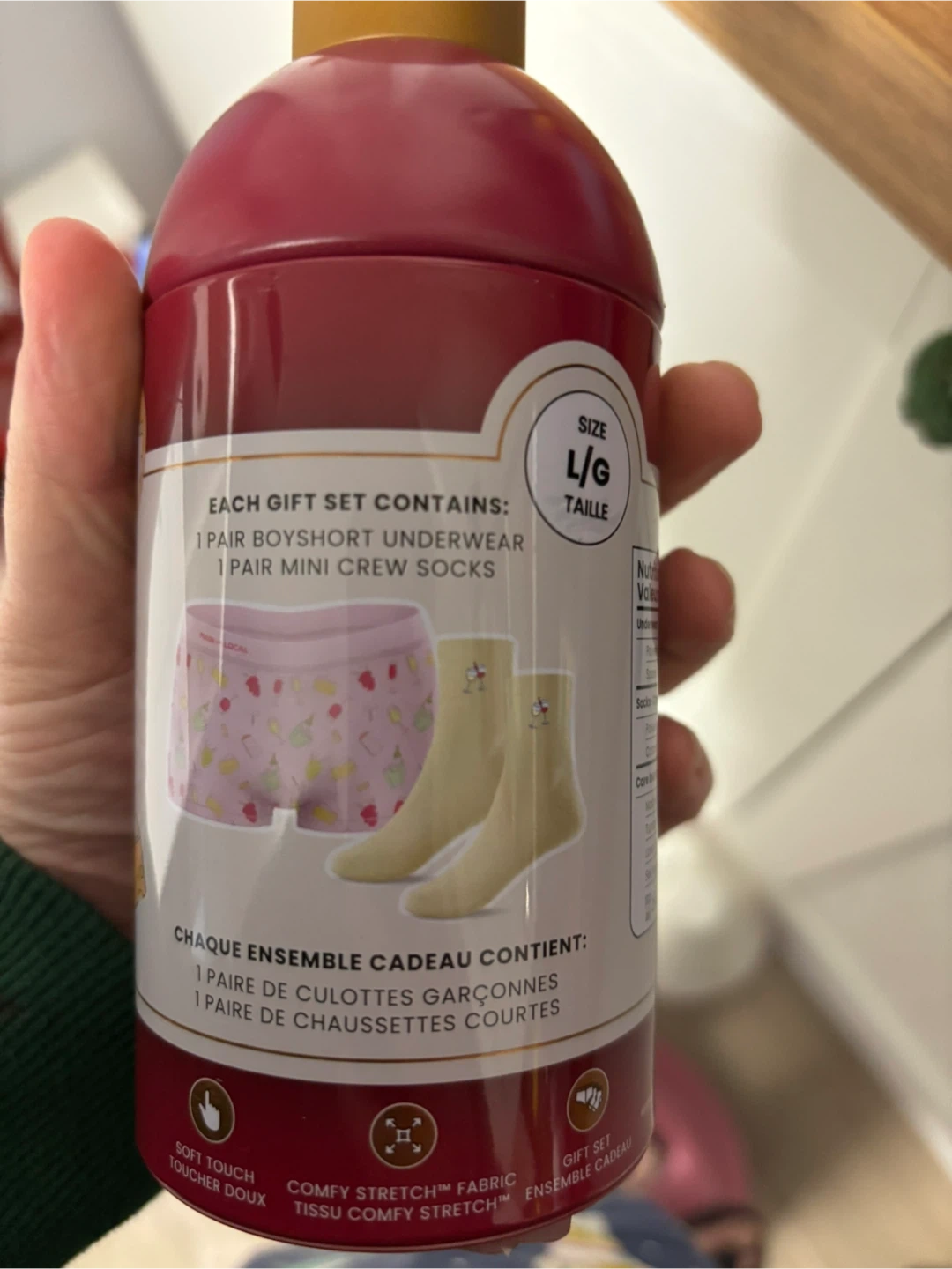 Wine & Cheese underwear & sock gift set in size L/G! This set contains one pair of boyshort underwear and one pair of mini crew socks. A fun gift for someone special!