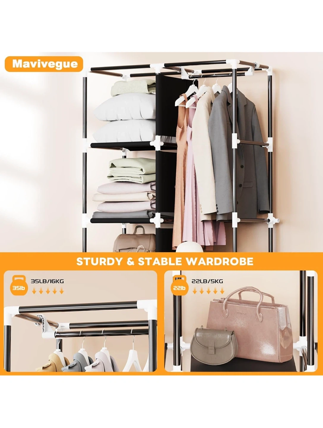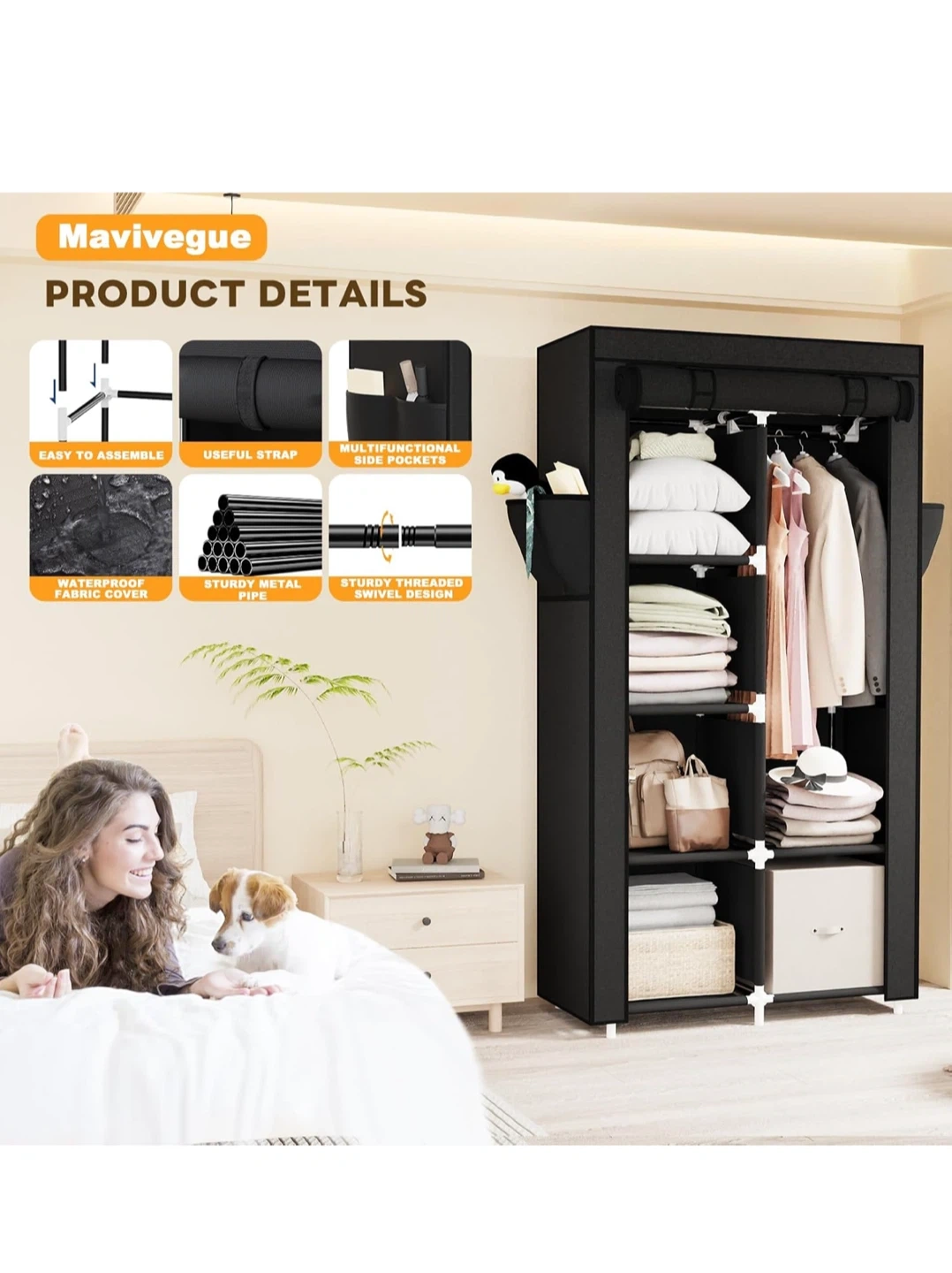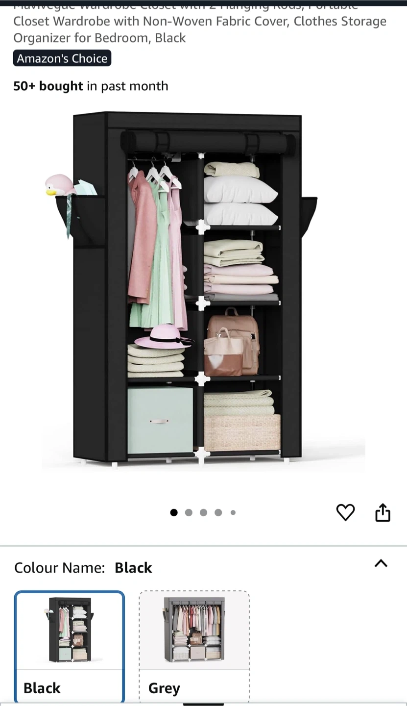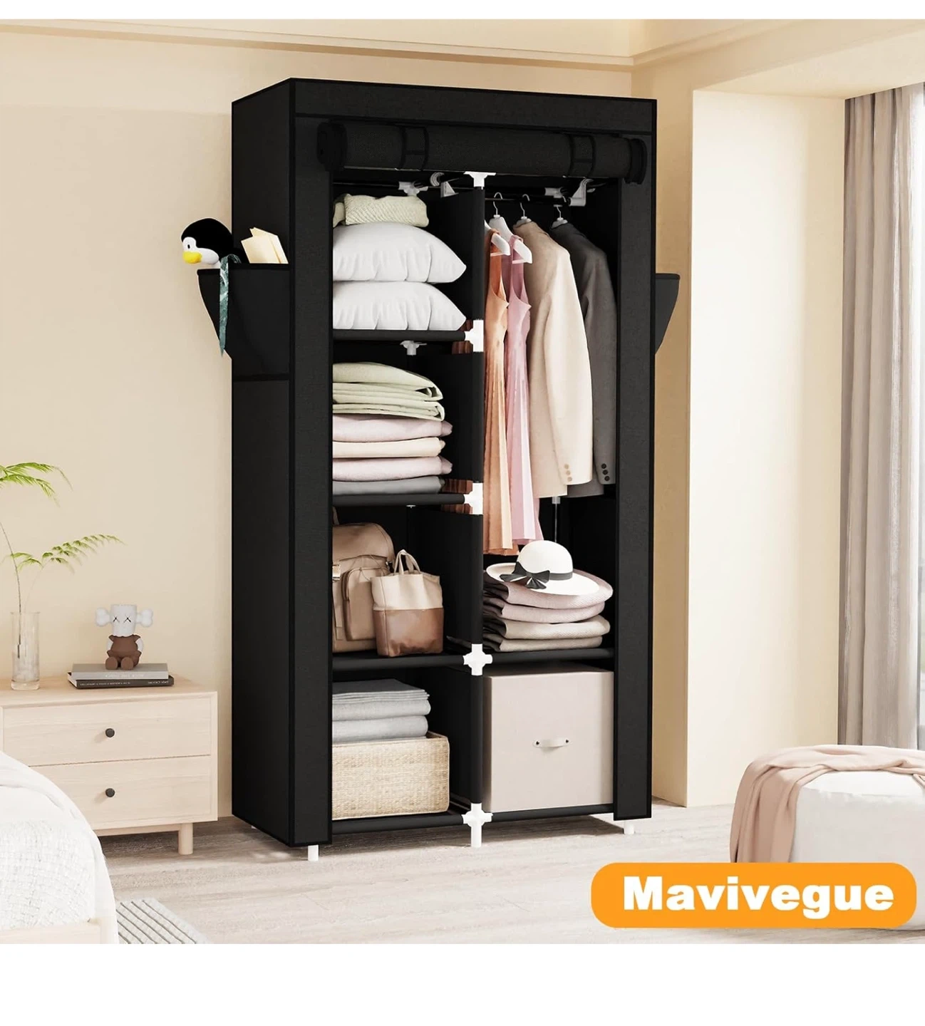 Selling a Mavivegue portable closet in black! It's a great wardrobe organizer for your bedroom. Key features: - Non-woven fabric cover - Clothes storage organizer - Dimensions: 16cm/63.4" height, 45cm/17.7" depth, 86cm/33.8" width - Sturdy metal pipe - Waterproof fabric cover - Multifunctional side pockets